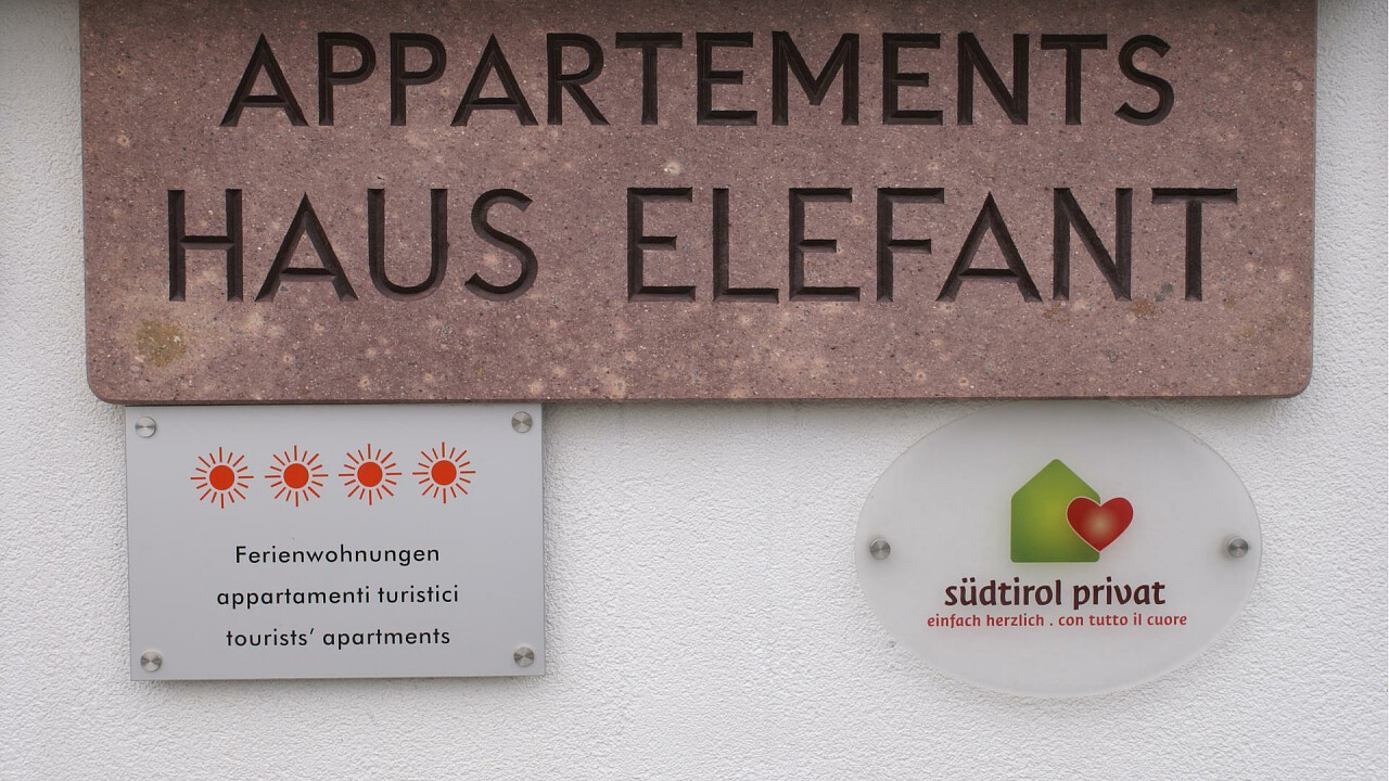 Das Haus Elefant liegt inmitten von Weingärten und Apfelanlagen im Herzen von Andrian. Unser erst neu errichtetes Haus entspricht den höchsten Klimastandards und wird ausschließlich mit Erdwärme betrieben. Durch die besonders ruhige Lage, dem herrlichen Ausblick auf die umliegende Bergwelt, im Besonderem den Rosengarten, und der liebevoll angelegten Liegewiese, ist unser Haus der ideale Ort um sich vom stressigen Alltag zu erholen und zudem ein idealer Ausgangspunkt für Wander- und Fahrradtouren. Wir bieten 2 helle geräumige Ferienwohnungen, welche komfortabel ausgestattet sind. Sie befinden sich im Parterre mit unmittelbar daneben liegender Liegewiese. Wir freuen uns auf Ihren Besuch!
