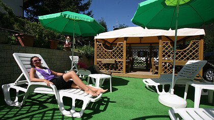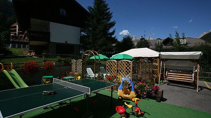 Weiter Annehmlichkeiten: Parkplatz, Garten mit Stühlen und Liegestühlen, Ski- und Fahrradraum, Tischtennisplatte, Tagungsraum, die Val di Fassa Card und Skipass-Service.