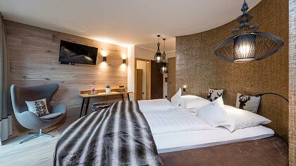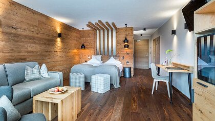 Die luxuriösen Zimmer und Suiten sind rustikal eingerichtet und verfügen über: Fernseher, Minibar, Bad mit Dusche, Fön, Rucksäcke und Wellnesstasche. Die elegante Anlage bietet auch gemütliche Appartements für bis zu 4 Personen, die über jeglichen Komfort verfügen.