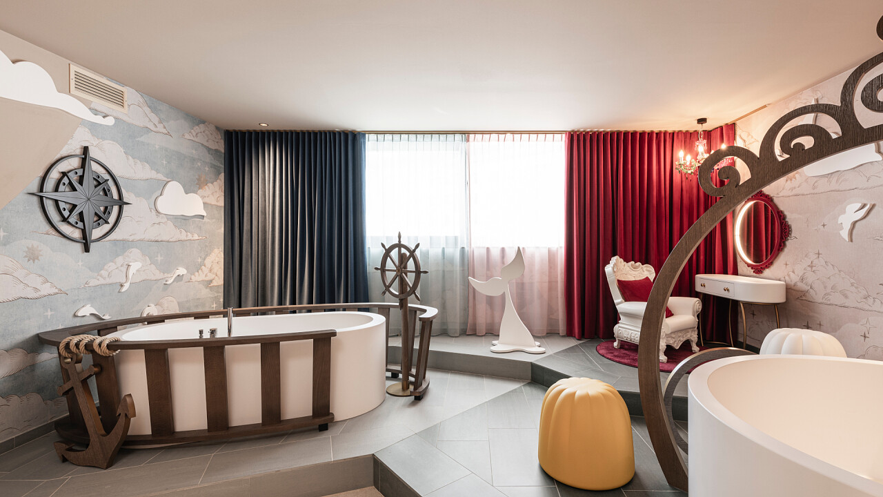 Der Wasserpark verfügt über eine Indoor-Rutsche, eine Rutsche mit Zeitmessung für Wettbewerbe, einen beheizten Infinity-Pool im Freien, einen natürlichen Schwimmteich mit einem Piratenfloß, einen Sandstrand und einen Ruhebereich.