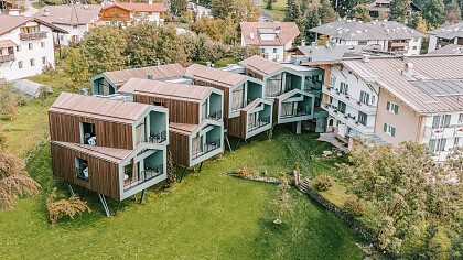Für diejenigen, die ein noch exklusiveres Erlebnis inmitten der Natur suchen, bietet das Parc Hotel Florian auch die FLORIS Green Suites: unabhängige, helle Chalets, die mit natürlichen Materialien gebaut und mit einer privaten Sauna ausgestattet sind. Die auf Holzstützen errichteten Suiten überblicken den bezaubernden Hotelpark und die romantische St. Valentin-Kirche und bieten einen bezaubernden Ausblick und ruhige Ecken. Ihre erhöhte Struktur, die die Integrität der Landschaft bewahren soll, erinnert an Baumhäuser und verleiht dem Aufenthalt einen märchenhaften Touch. Eine Oase der Ruhe vor den Toren der Dolomiten, ideal für alle, die Komfort, Nachhaltigkeit und Design miteinander verbinden möchten.