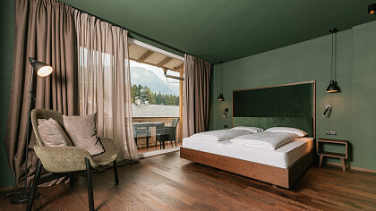 Im Doppelzimmer Green genießen Sie luxuriöses, hochwertiges Interieur mit Regendusche, Balkon und Schlernblick. Großfläc...