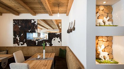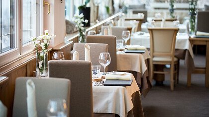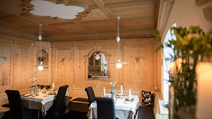 Im Restaurant genießen die Gäste mit ¾ Pension ein reichhaltiges Frühstück, eine leckere Zwischenmahlzeit mit hausgemachtem Kuchen und ein köstliches Abendessen, das von einer raffinierten Weinauswahl aus dem Weinkeller begleitet wird. Auf Nachfrage werden auch spezielle Menüs für Kinder und Personen mit Nahrungsmittel-Unverträglichkeiten oder speziellen Diäten angeboten.