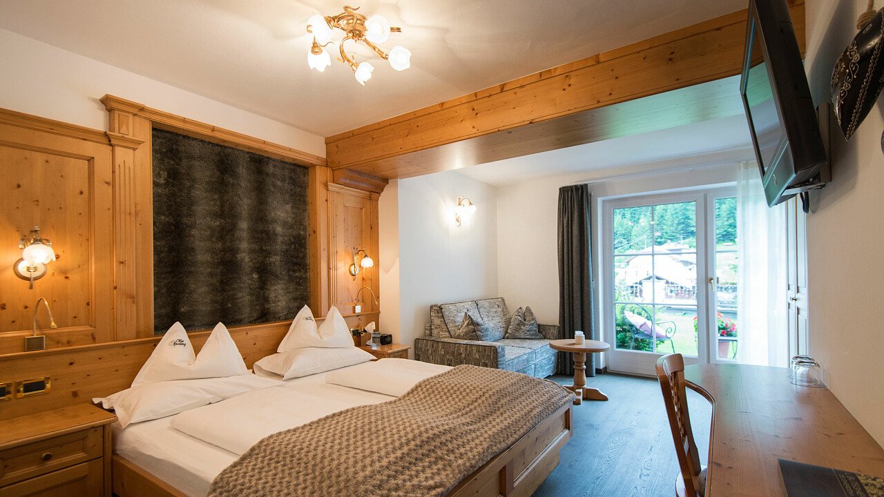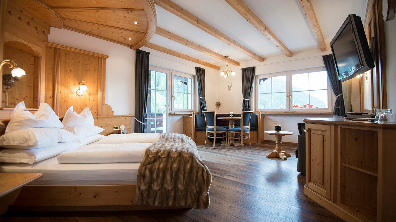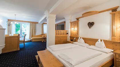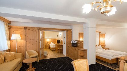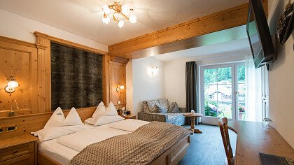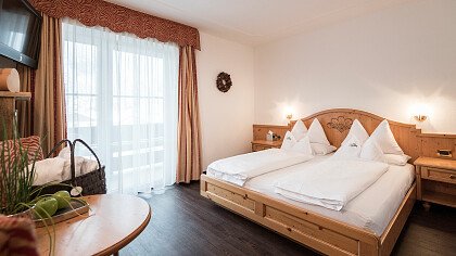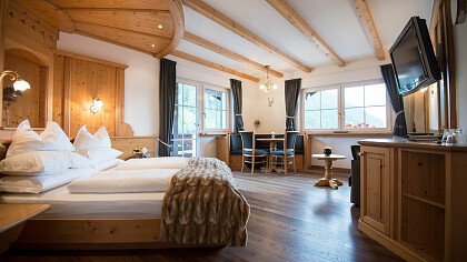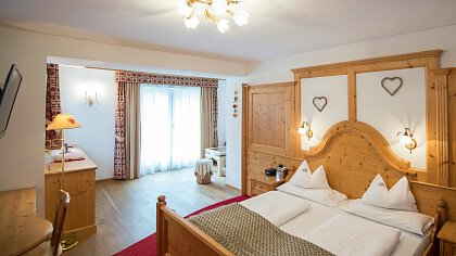 Die Einrichtung mit vielen Holzelementen und das exklusive Ambiente des 4-Sterne-Hotels sorgen für eine warme und gemütliche Atmosphäre. Die luxuriösen Zimmer, Suiten und Familienzimmer sind bis ins kleinste Detail gepflegt und bieten einen spektakulären Blick auf die Dolomiten oder das umliegende Tal. Alle Zimmertypen sind ausgestattet mit: Bademänteln für Erwachsene und Kinder, Schlappen, Haartrockner, Leihrucksack, Informationsmappe, Fernseher, WLAN, Safe, Radio, Telefon und Minibar.