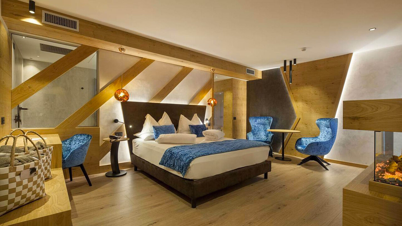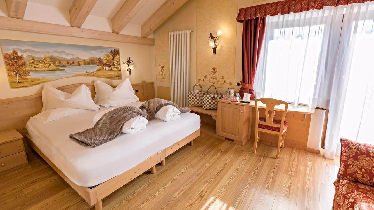 Its rooms and suites are furnished in Alpine style, but with design elements conceived for absolute relaxation. They have a balcony with a view of the Dolomites, private bathroom, sofa bed, king-size beds, mini-bar, tea and coffee corner, safe, desk and wellness kit for each adult (bathrobe, sauna towel and slippers).