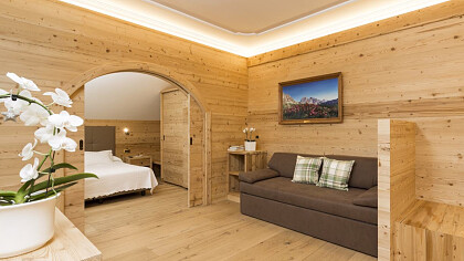 The hotel is the ideal starting point for an all-season outdoor holiday. If in winter you ski or snowshoe, summer invites you to hikes, motorbike or MTB tours along the famous Dolomite passes and climbing. Outside the hotel there is also a new health trail in the forest.