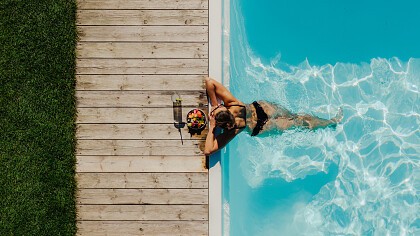 Wellness area on the lower floor: A small but refined textile area with a sauna and relaxation zone. Outdoor pool (heated until the end of September, used as a refreshing cold-water pool during winter after a sauna session). Whirlpool with a constant, comfortable temperature of 36°C – all year round.