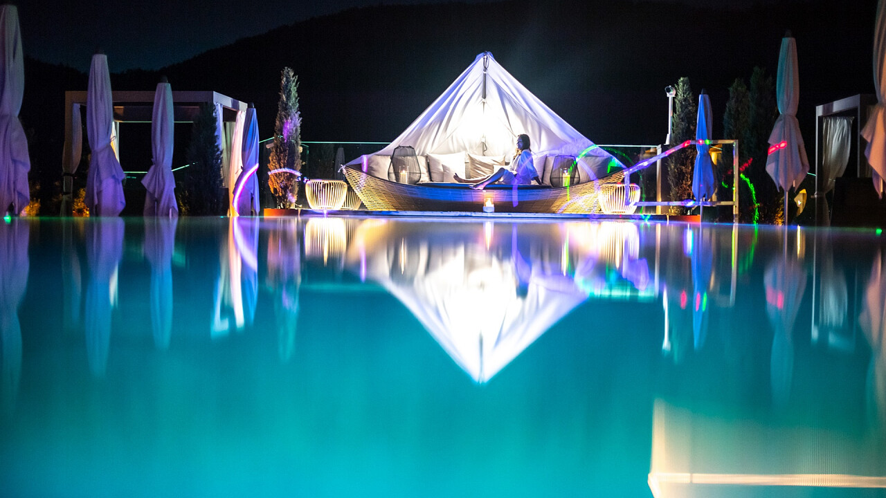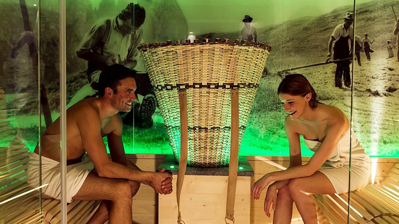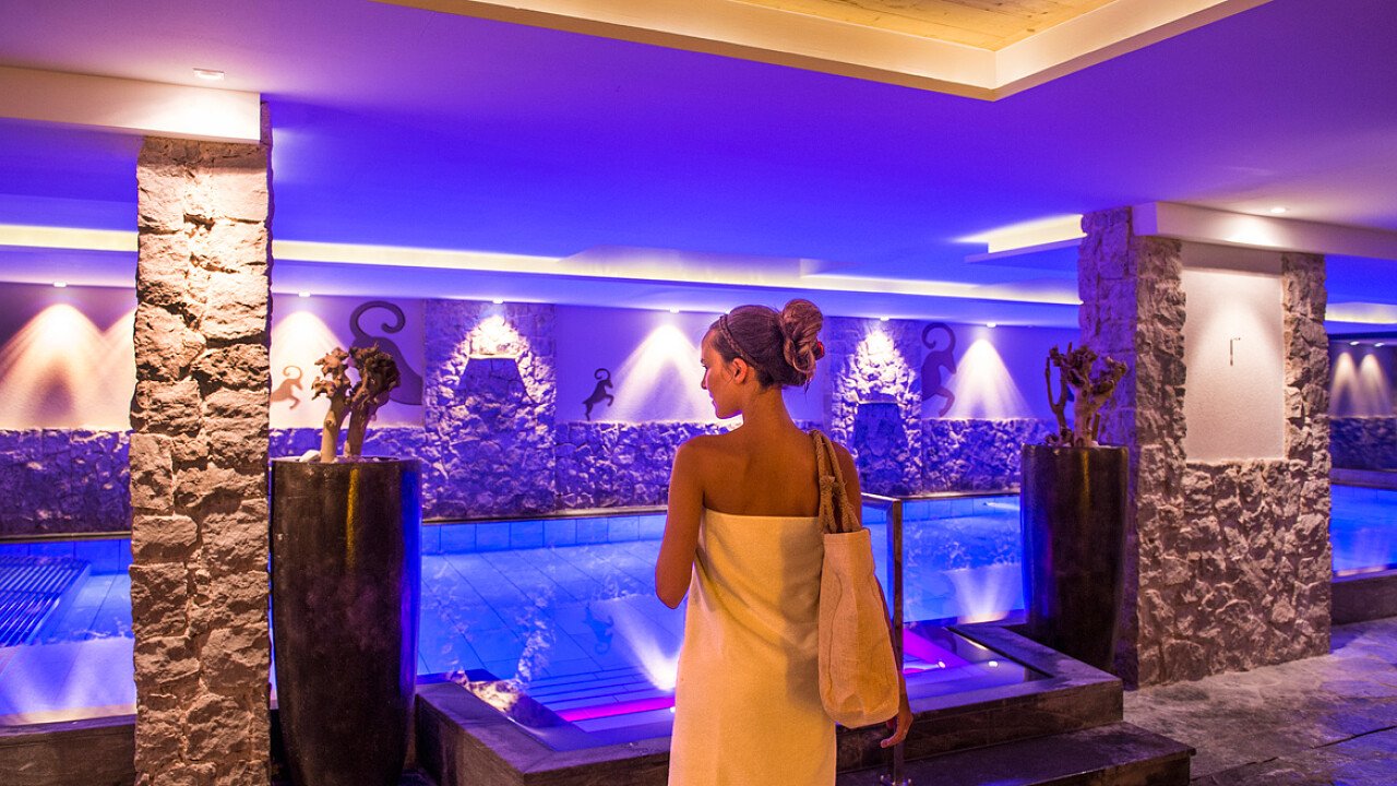 Moreover: floating water bed, Private Spa, massage cabin for two, relax room with hay beds, hay bath, salt cave, alpine herbs and Swiss pine wood steam bath, steam bath with rock crystals, Kneipp therapy pool, multi-sensory showers, relax salt pool and alpine stone Vitarium Alpinum, with backlight and background music.
