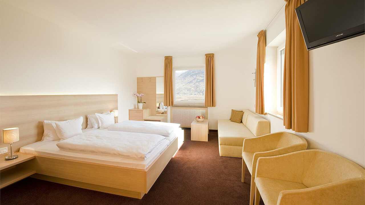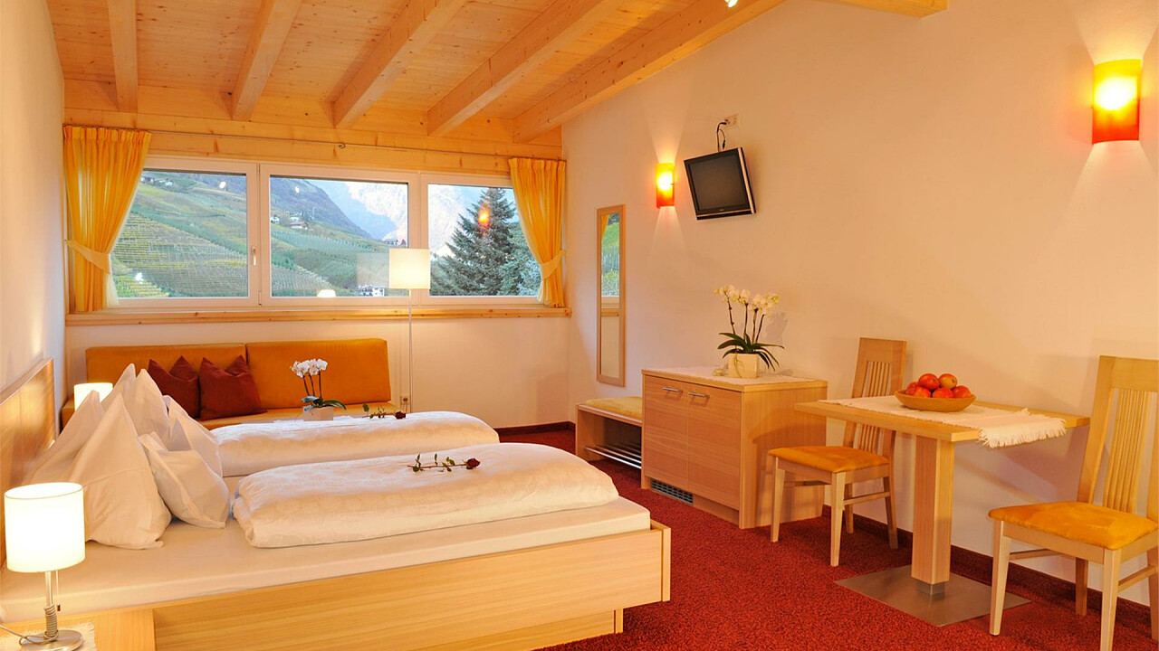 Family-friendly inn in a peaceful and panoramic position. Modern comforts and a relaxing atmosphere. A particularly quiet location on an lofty slope with a majestic view of Meran, the Adige Valley and the surrounding mountains. Your children-friendly hosts make a point of taking personal care of you: they always have time for a friendly word and some good hints.