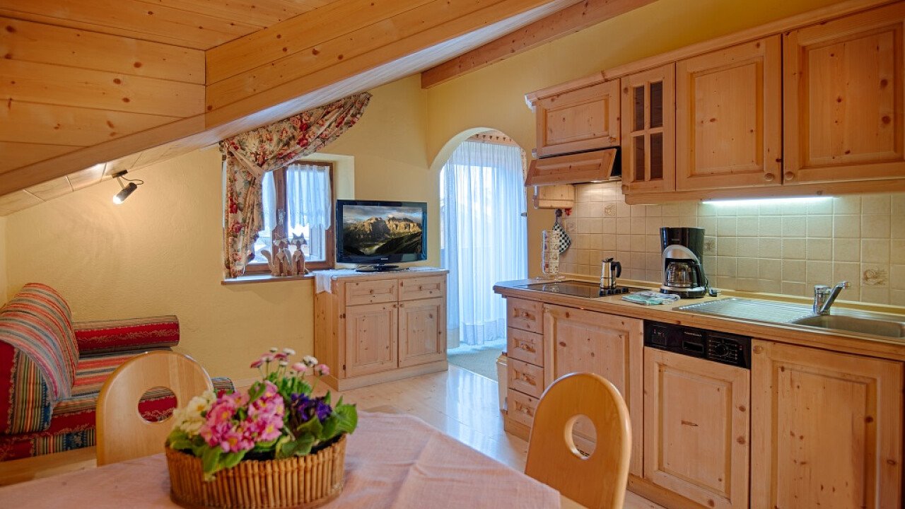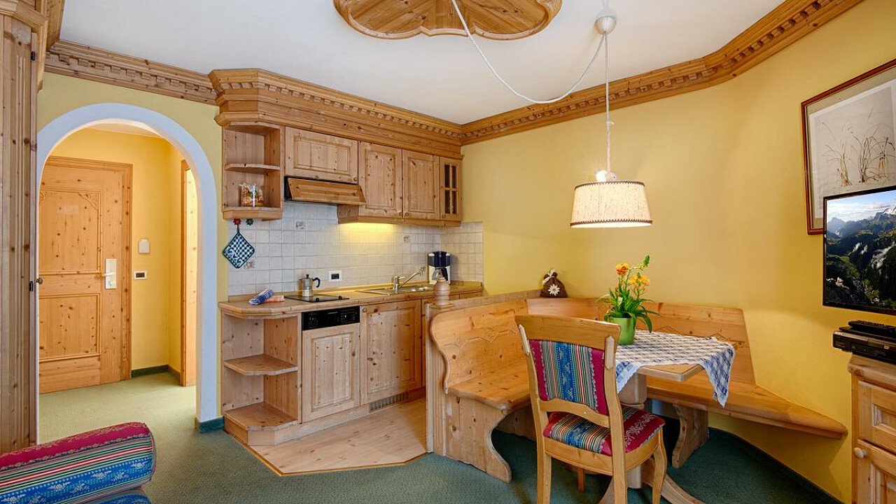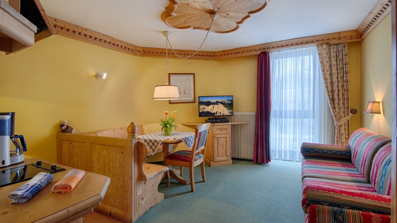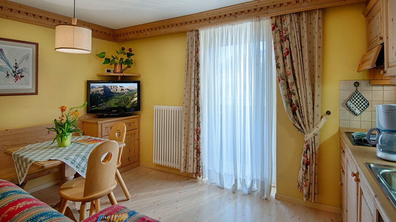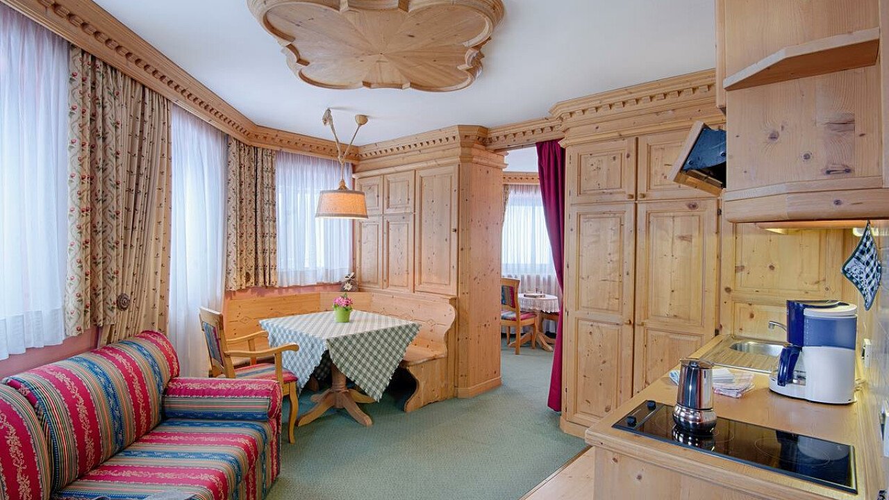 The apartments, distributed on two floors and with a lift always available, are furnished in typical Alpine style. They are provided with bath tub/shower, WC and bidet, hairdryer, fully equipped kitchen, living room, TV, Wi-Fi, phone, safe and balcony. In addition we also have comfortable apartments for people with disabilities with all services and comforts right to satisfy everything you need.
