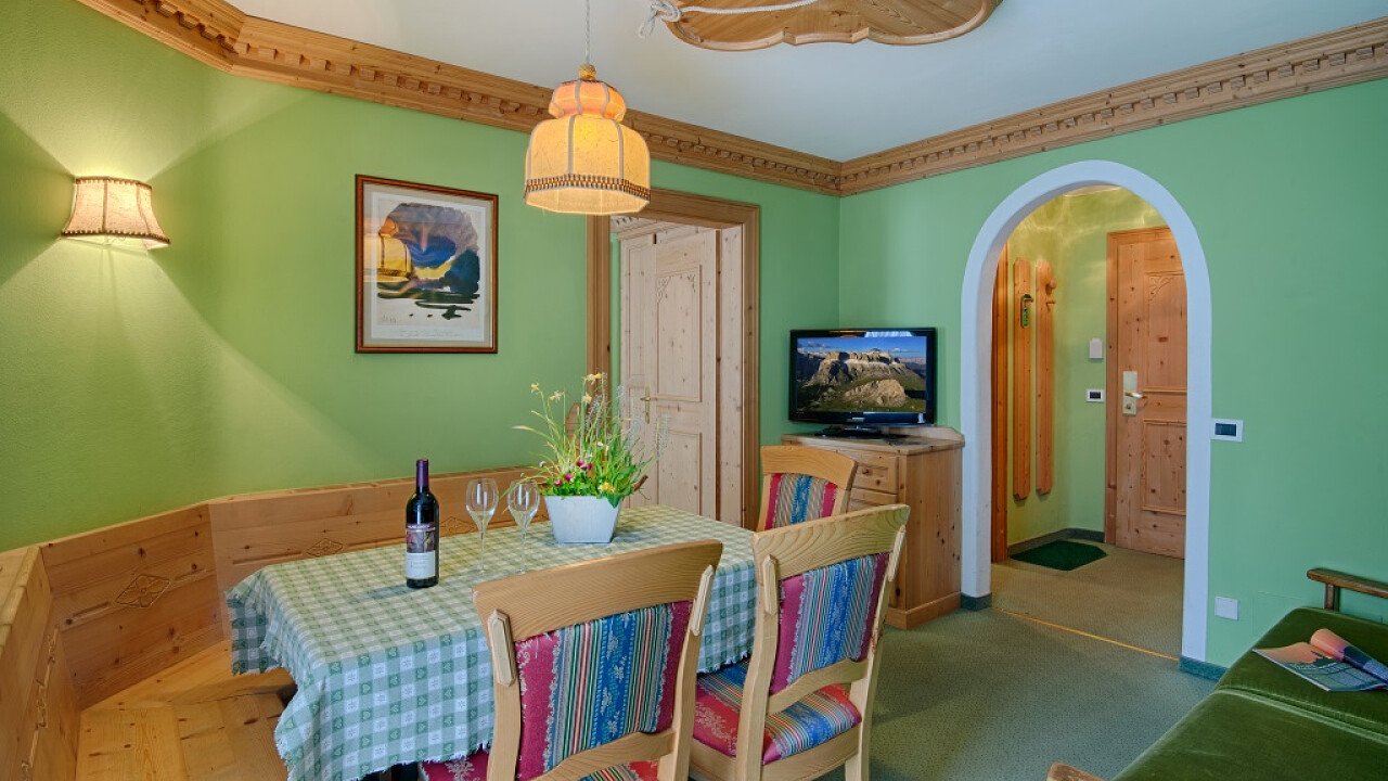Apartments Peter, in Colfosco, Alta Badia, are located in a central position at the feet of Sella and Sassongher. It is a renowned destination for those who love golf, trekking (the hotel lies near the nature reserve Parco Naturale Puez-Odle), and winter sports, especially skiing, since the Dolomiti Superski ski domain is not far away.