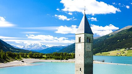 In the north west section of the province of Bolzano, in the Alta Val Venosta valley, rises the lake plateau of Resia Pass, bordering with Malles Venosta, Austria, Switzerland and the Resia Pass. Besides the distinctive bell tower of the Resia lake, Curon Venosta features several cycling tracks, like the Via Claudia Augusta, and hiking trails. In winter, skiing is the most popular sport here, and the area offers three ski centers: Belpiano, Malga San Valentino and Nauders. Other sports you can practice are snow kiting and ice surfing on the Resia Lake.