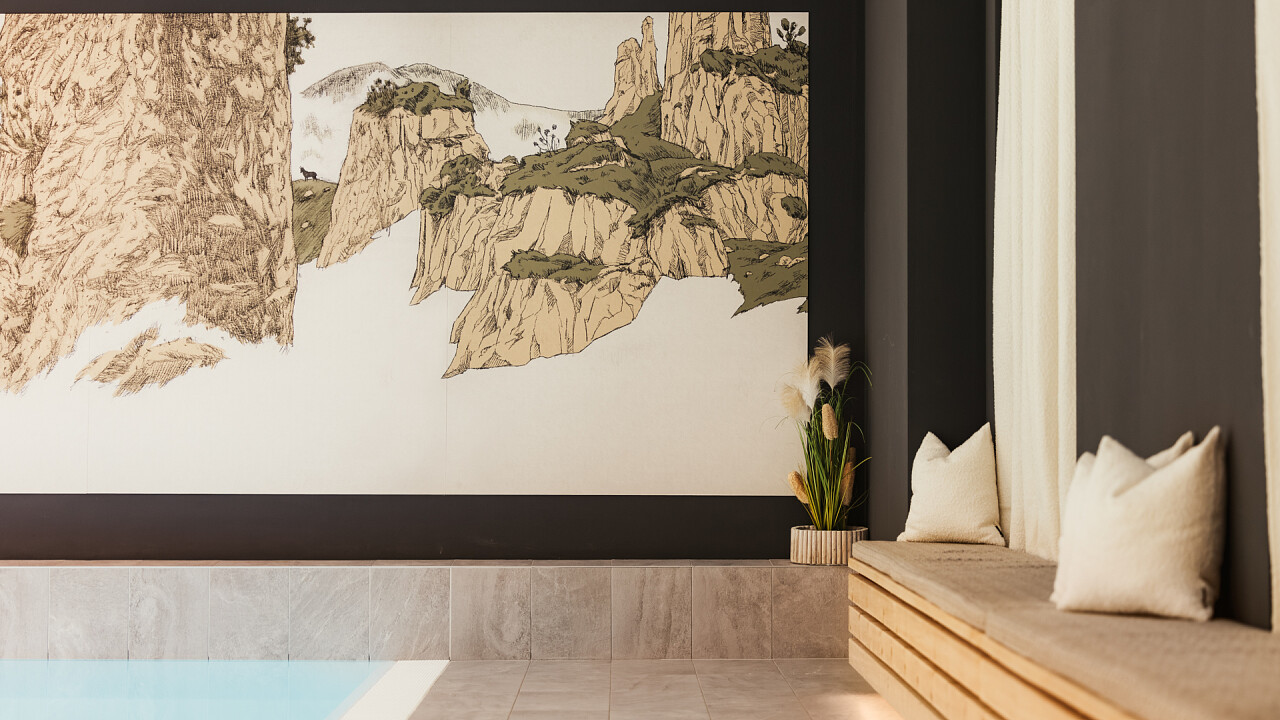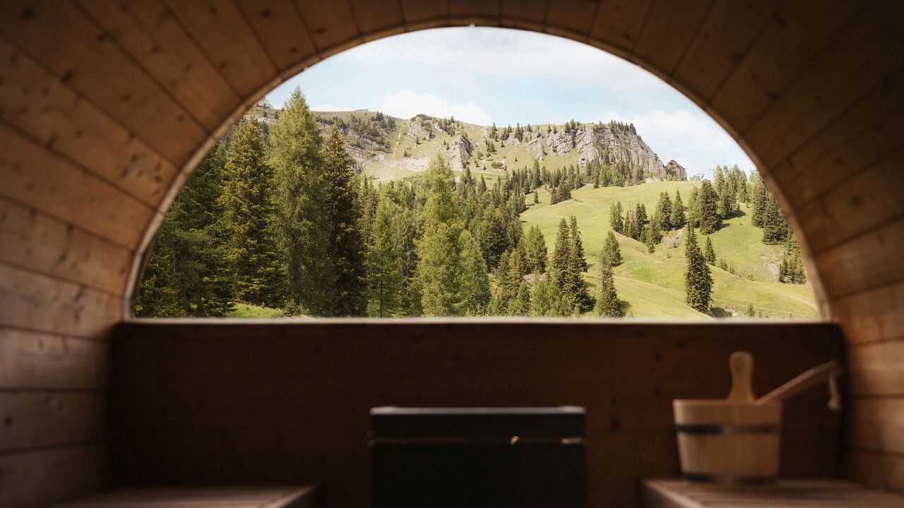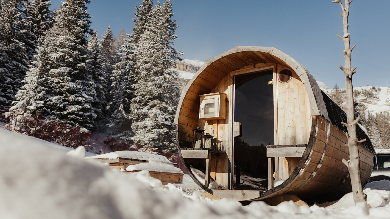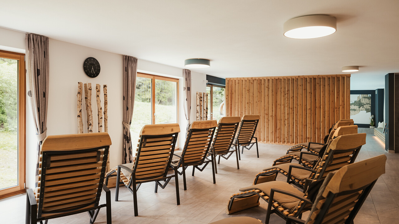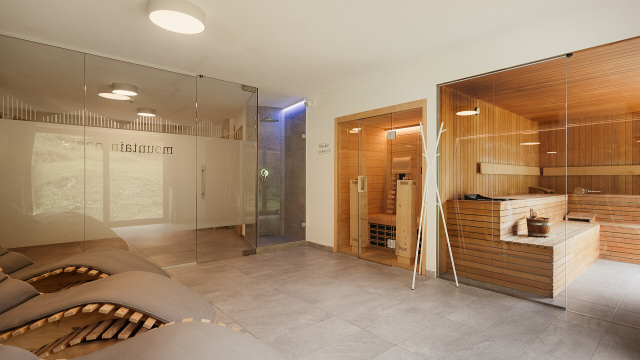 The 240-square-metre Mountain Oasis wellness centre features a 10 x 4-metre panoramic indoor infinity pool, which is also accessible to children under 16 years of age and has deckchairs positioned in front of a large window with a panoramic view of the "Campolongo" ski slope no. 29 and the Boè Massif, a panoramic Finnish sauna, Turkish bath, infrared sauna, foot bath, whirlpool and multi-jet shower cabins, fitness room and relaxation areas with comfortable natural wood beds.