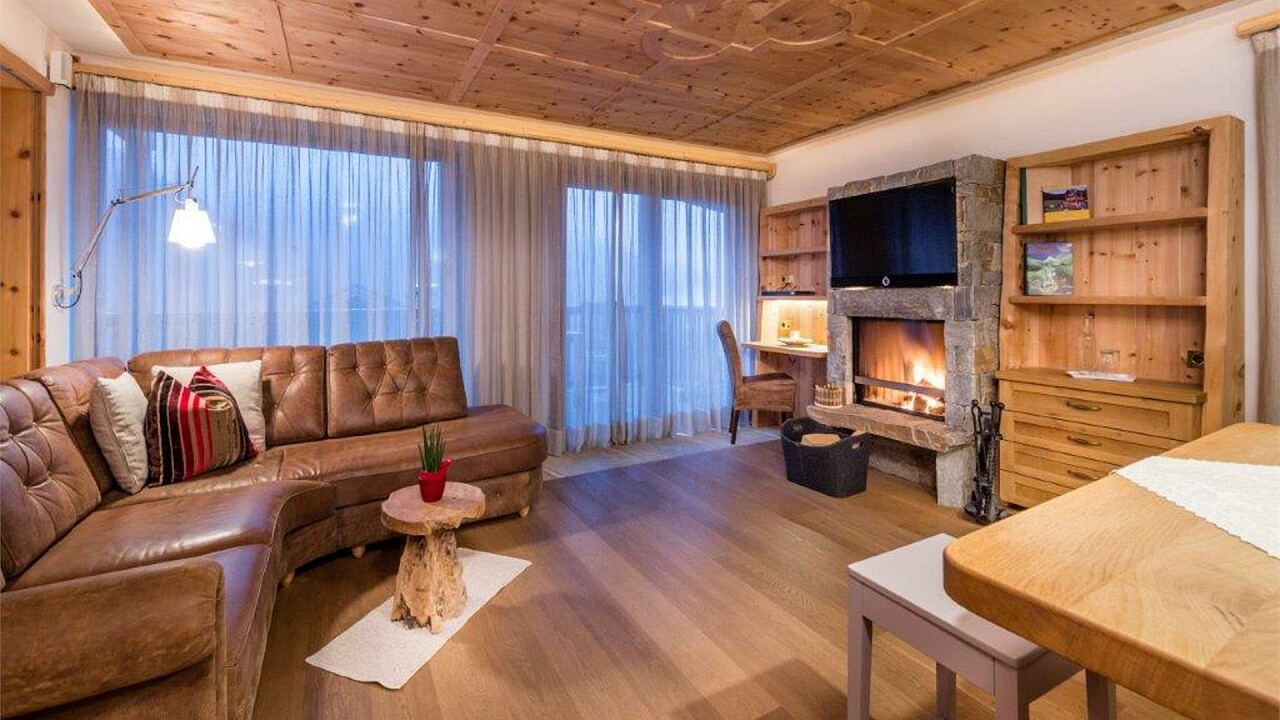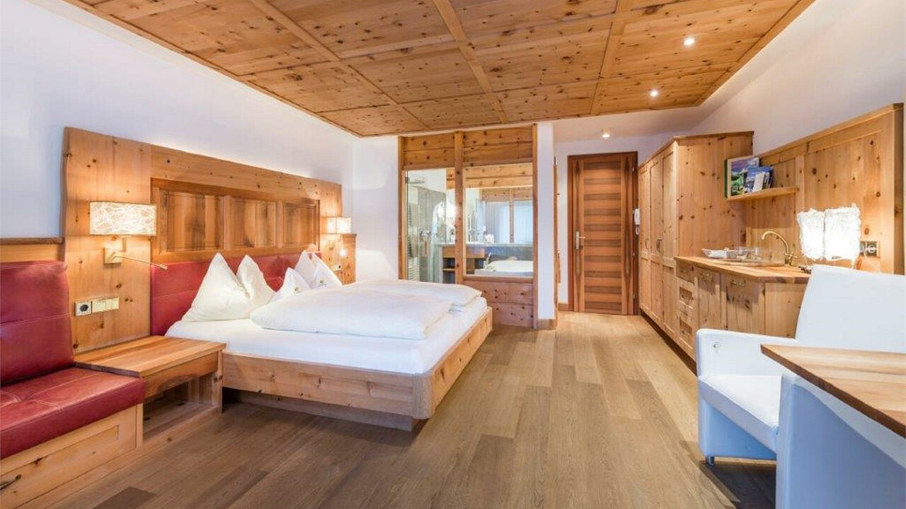 Spacious, organically panalled with natural stone and pine wood from the Valley of Lüsen, they are a true masterpiece of craftmanship. The bathrooms in marble, the floors in oak, the two spacious Wellness suites as well as the two cosy Zirm rooms on the 3rd floor are located at 150 meters of the hotel. The open fireplace, sauna and whirlpool create a romantic ambience.
