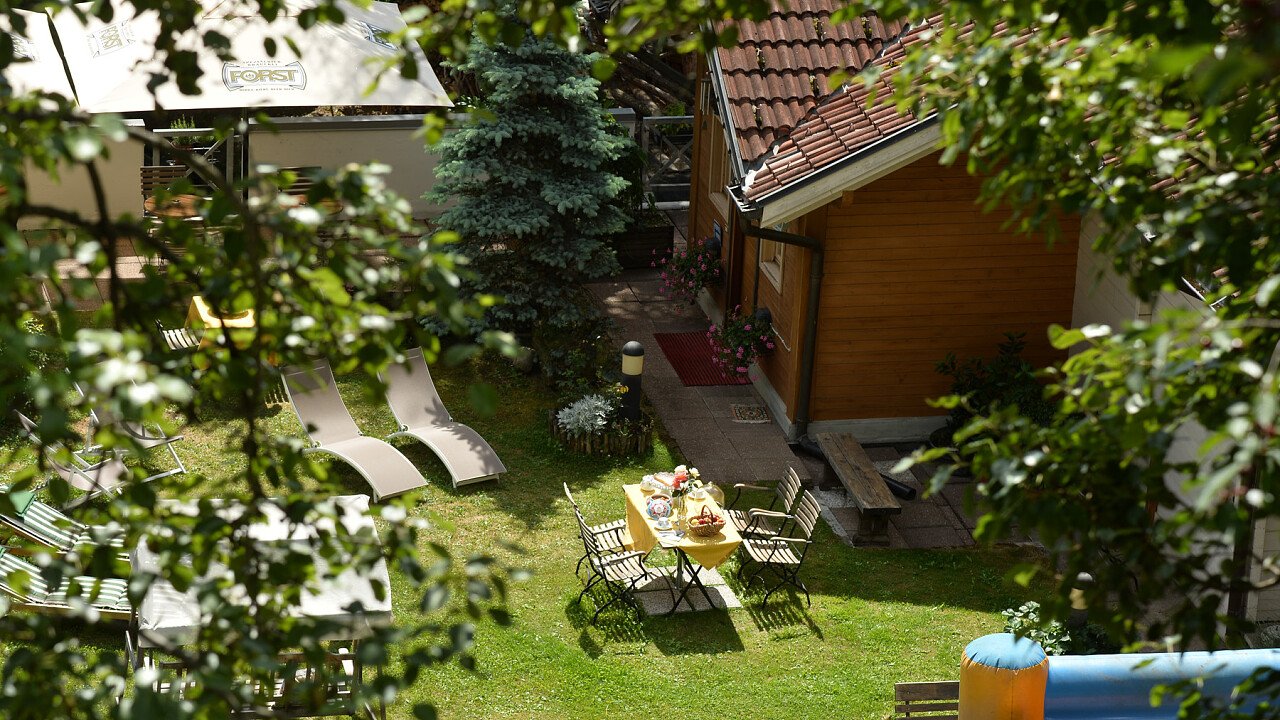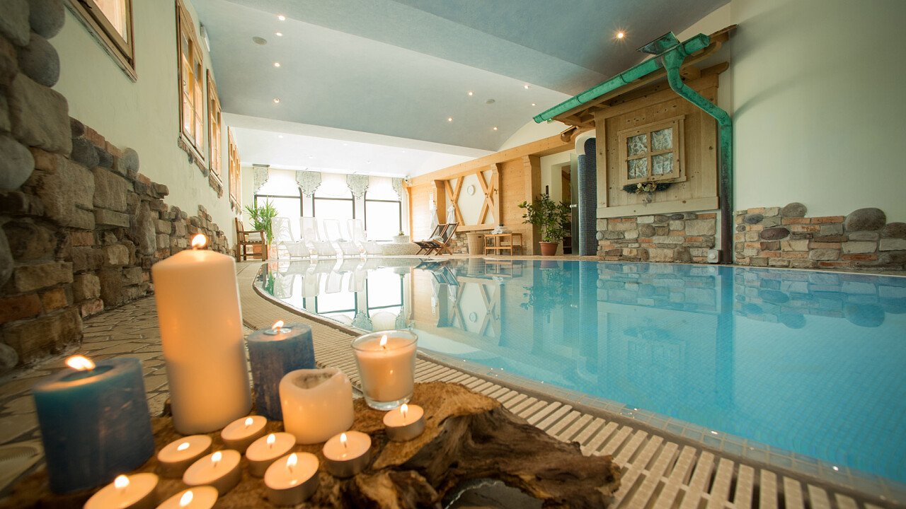 The wellness area, furnished like an old mountain farm with a shingle roof, wood paneling, and flowered balcony, is equipped with an indoor swimming pool, Kneipp path, Finnish sauna, alpinarium, relaxation area, herbal tea corner, cold mist, Scottish shower, relaxation areas, and an infrared cabin.