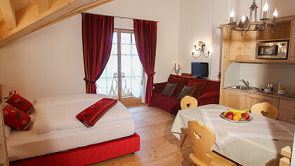 The building has twelve furnished apartments decorated with fir wood and embellished with wrought iron chandeliers and colored curtains. The apartments are divided into studios and two-roomed apartments for 2 to 5 people and consist of a bathroom with shower, well-stocked kitchen, TV with Sky box, Wi-Fi, telephone, safe, and towels. Some have a balcony with panoramic mountain views, while others have wood-beamed ceilings. The final price includes cleaning, midweek linen change, and electricity.