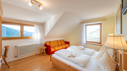 The 'Madrutt Suite' faces directly onto the mountain symbol of the Monte Corno Nature Park, surrounded by spruce and whi...