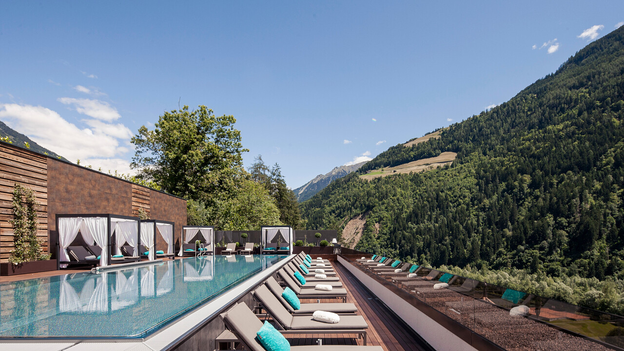 The five-star hotel in the Passeier Valley is also the ideal choice for a family holiday. Many services are available to them: Acqua Family Parc, Family Spa with sauna area for families (dress on) and indoor pool with heated whirlpool, outdoor pool with large slide and bar in the pool area, play rooms, Mini club (for children from two years of age) open all year round with games, fun and free lunch, football pitches and beach volleyball with supervised games, rental of bottle warmers, baby changing tables, baby phones, pushchairs and baby backpacks, Eco Quad adventure, wild river tubing, canyoning, rollerball, dry ice and climbing (extra charge) and new Action Parc with interactive trampolines, ValoJump, ValoClimb, iWall, interactive bouldering gym and much more.