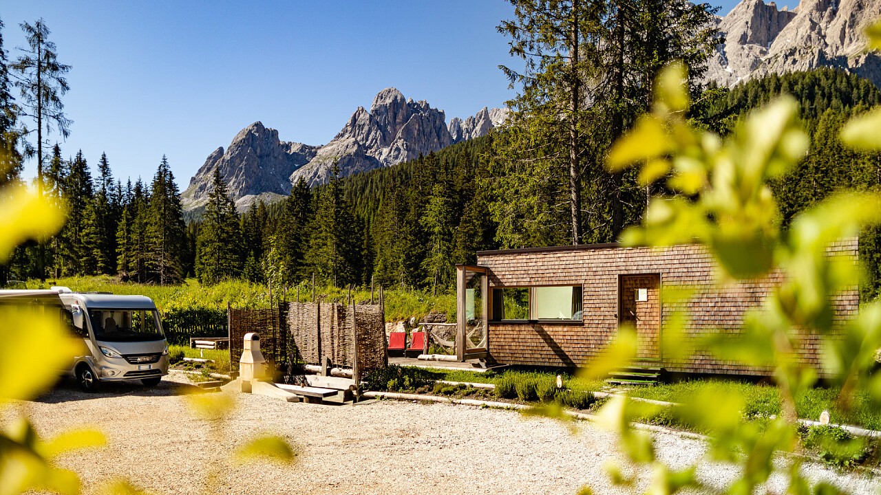 The Caravan Park Sexten welcomes its guests in an elegant setting surrounded by nature, offering accommodation options to suit every need. The caravan pitches, available in Comfort, Premium, and Leading600 types, feature electric hookups, drinking water, and grey water disposal. Three modern sanitary buildings are available, two with child-friendly areas, while guests seeking more privacy can rent private bathrooms for a relaxing and comfortable stay.