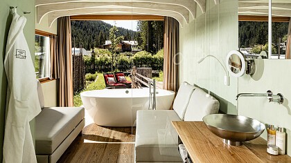 For an even more exclusive escape, the Caravan Park Sexten invites guests to discover its luxurious tree houses, crafted in bio-architecture wood and equipped with whirlpool, private sauna, and sensory shower. A romantic hideaway suspended among the trees, where wellness meets nature.