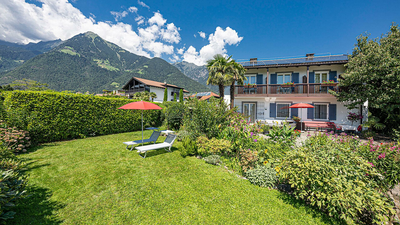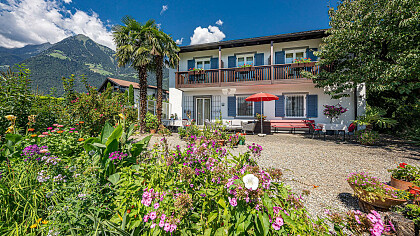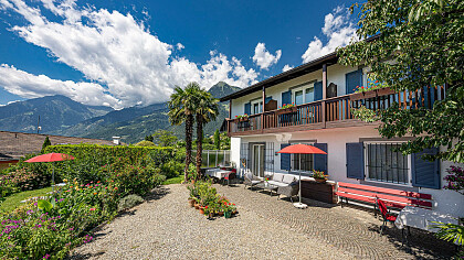 Our house is located a little bit off the road, quiet and idyllic in the middle of the green. It also lies next to the wide nature park "Burglehen" with a wonderful view of the Merano valley basin.