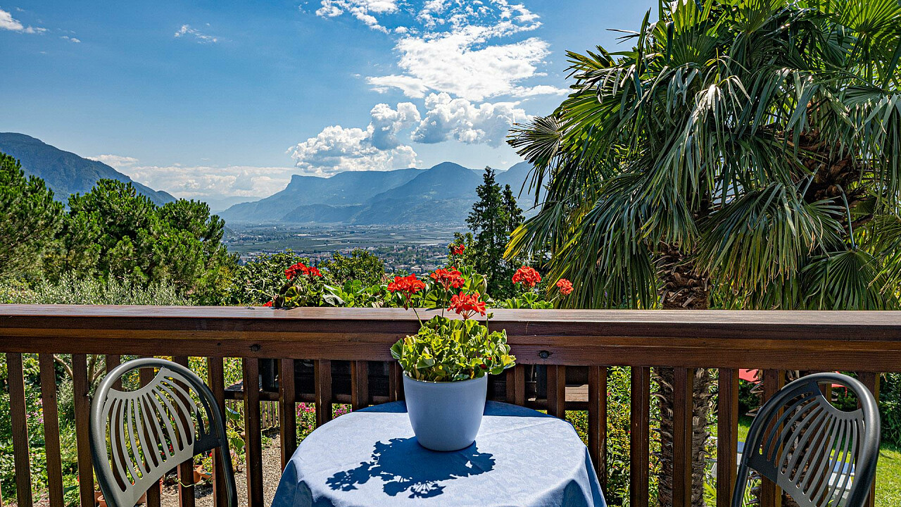 From your panoramic sun balcony you will enjoy a unique view of the mountains surrounding Merano, down into the Adige Valley and up into the Vinschgau Valley.