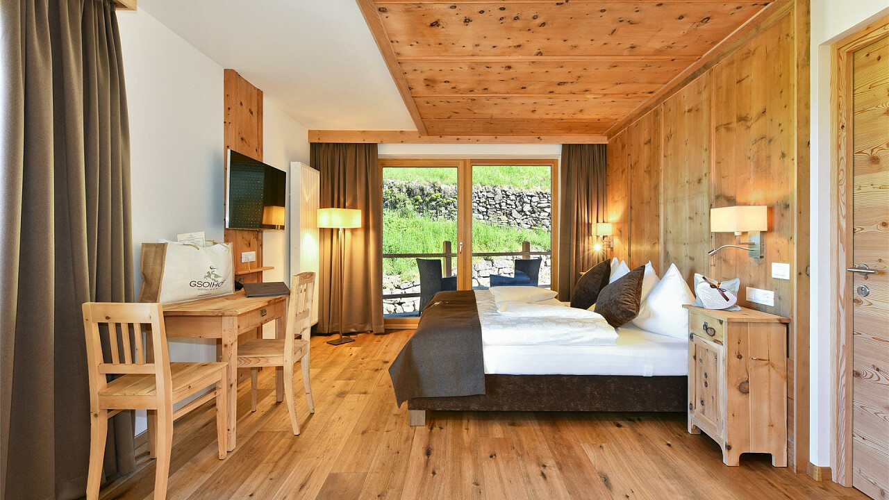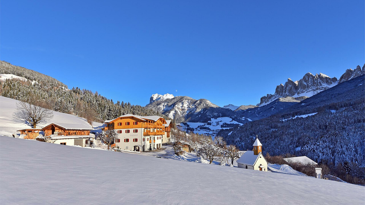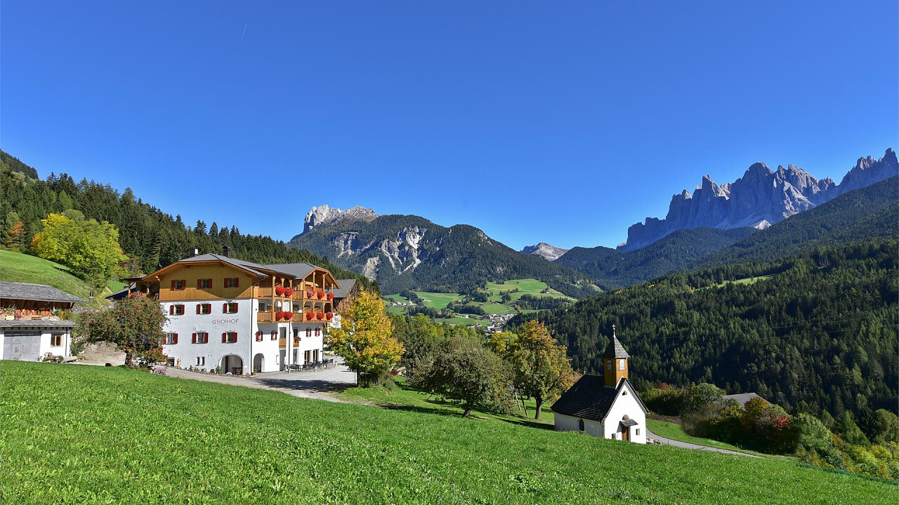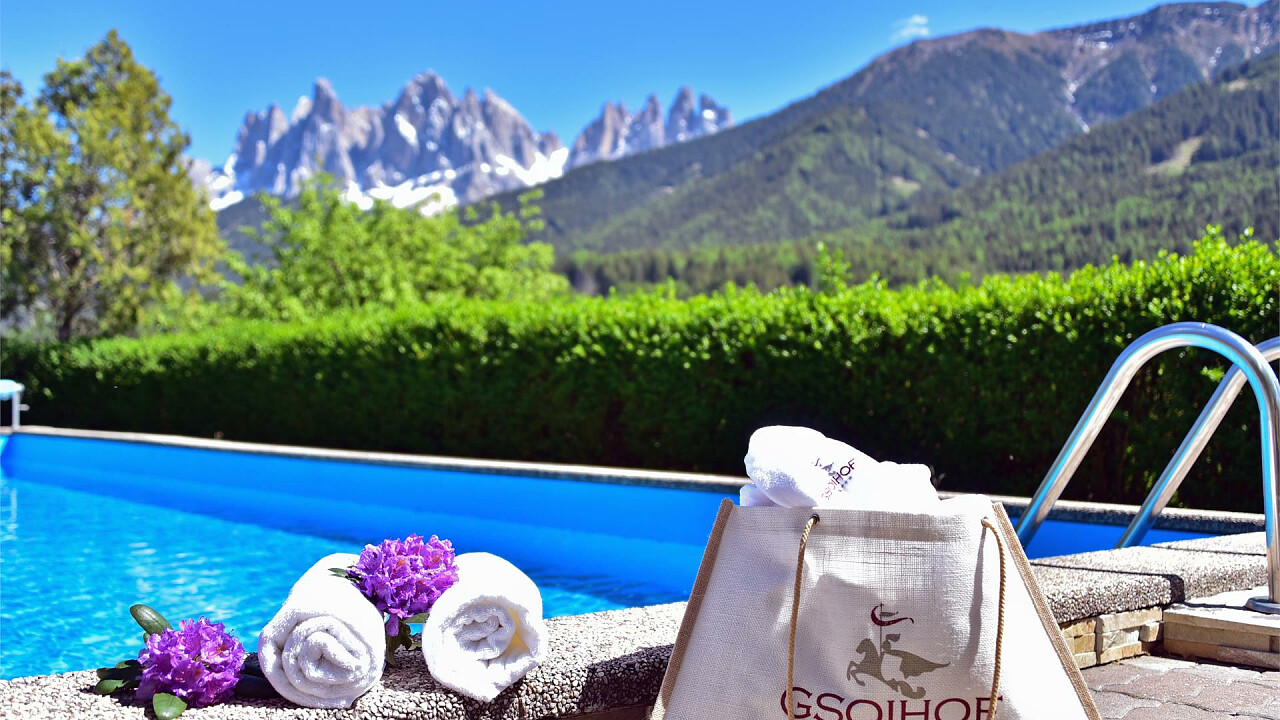 Spend your wonderful holiday at the romantic farm hotel Gsoihof. We are in a very quiet location, on the sunsite of the valley. Our house offers you a fantastic view of the mountains „Geislerspitzen“ and on the valley. Relax in the our new rooms with view or on the outdoor pool with a beautiful view of the mountains. The Hotel Gsoihof is a good starting point for different escursions and is at the same time a direct access to the Dolomites. Our cook Helmut spoils you with culinary menu with local products. Enjoy a glass of wine in our hotel garden after dinner and have a nice evening.