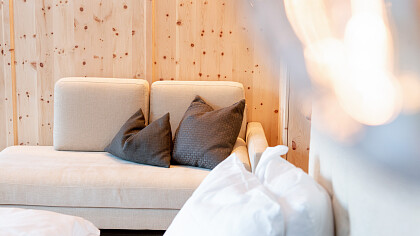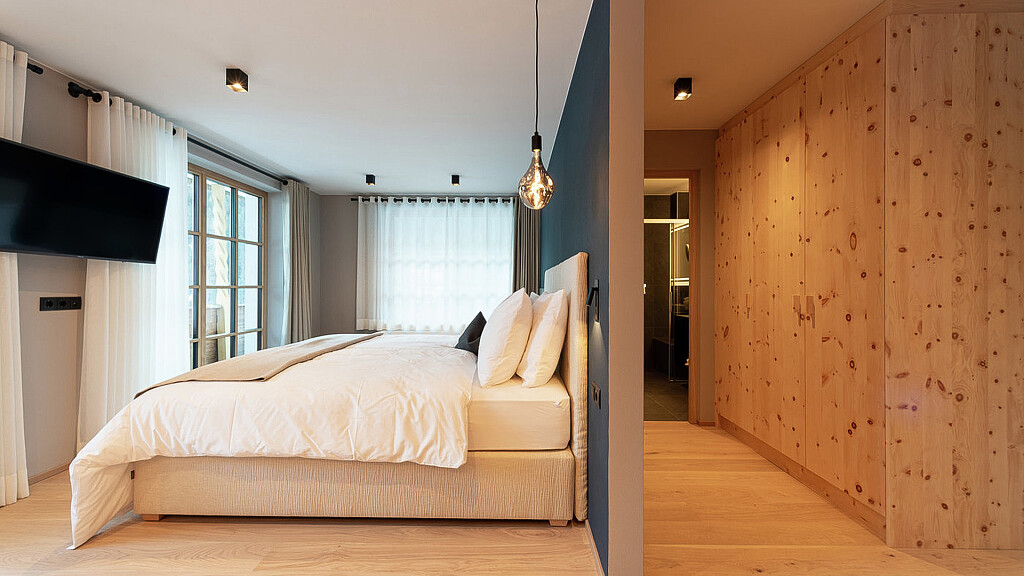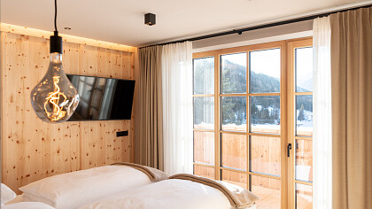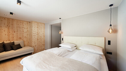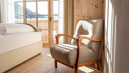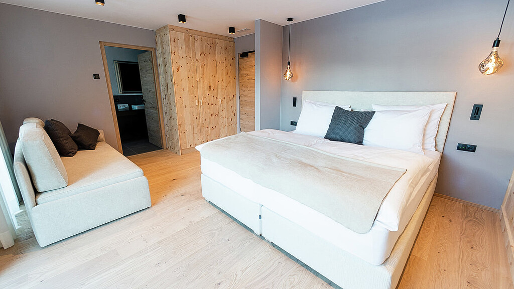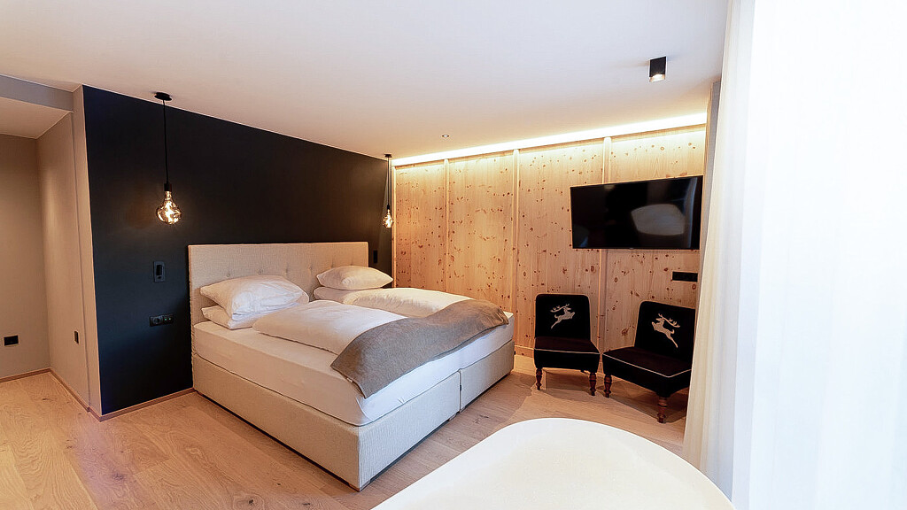 The new, spacious double room superior with real wood floor in oak, furnished with fragrant pine wood from our own fores...