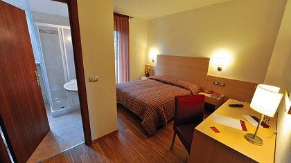 Le accoglienti e luminose camere e suite sono arredate in legno e si compongono di bagno con doccia o vasca, phon, TV, telefono, cassaforte, Wi-Fi e, alcune, di balcone con vista panoramica sulle magnifiche Dolomiti del Brenta.