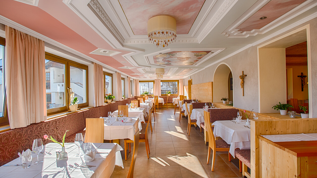 Lasciatevi deliziare nella sala da pranzo panoramica da una delle combinazioni di cucina tirolese e tradizione ladina accuratamente scelte per voi.