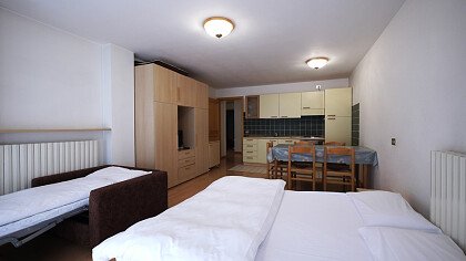 I monolocali offrono zona giorno con 2 divani letto, angolo cucina, WC, doccia, TV e garage. Alcuni sono forniti di cassaforte, lavatrice e lavastoviglie.