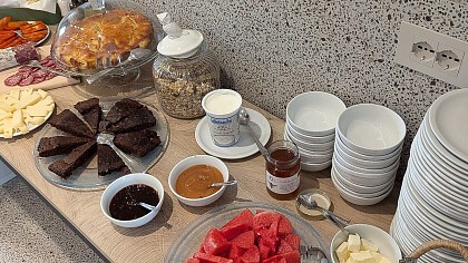 Gli ospiti delle camere possono gustare una colazione con prodotti freschi del territorio servita nella luminosa Sala colazioni al piano terra. Chi alloggia negli appartamenti, invece, può richiederla comodamente in alloggio, per un inizio giornata riservato e rilassante.