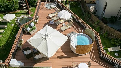 Per i momenti di relax, sono a disposizione la piscina coperta con vista panoramica e idromassaggio, la sauna finlandese, la bio sauna, il bagno turco, il solarium, il reparto beauty, la sala fitness e relax. Nel periodo estivo il giardino-terrazza-solarium invita a crogiolarsi e gustare il sole di montagna.
