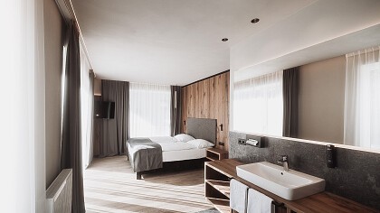 Le camere e le suite sono luminose, silenziose e curate nei dettagli, con materiali naturali che richiamano la tradizione altoatesina. Offrono balconi panoramici, letti confortevoli, bagni moderni e servizi pensati per garantire un soggiorno rilassante, tra cui Wi‑Fi veloce, morbidi accappatoi e un ambiente che invita al riposo. Sono perfette per chi cerca tranquillità e desidera vivere una vera esperienza di vacanza in montagna.