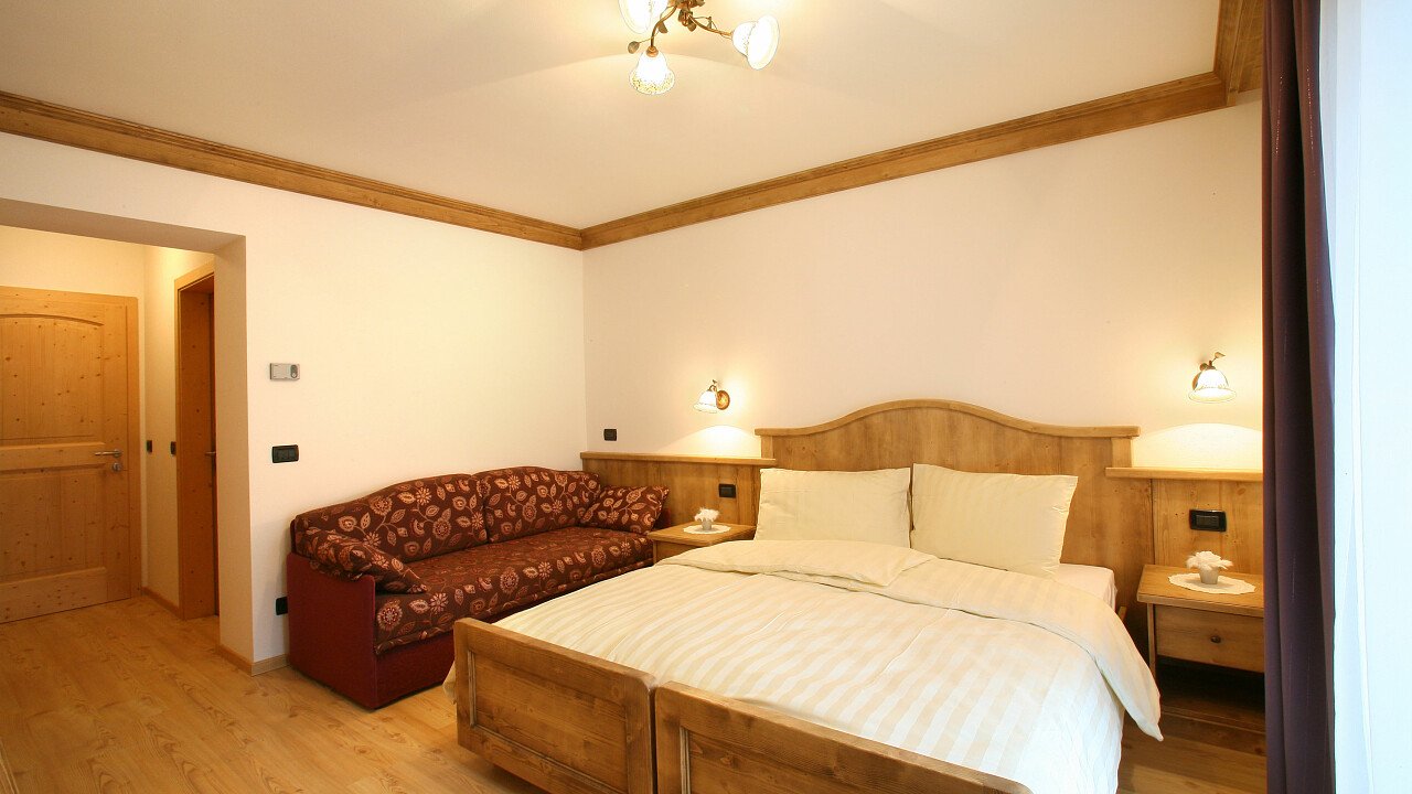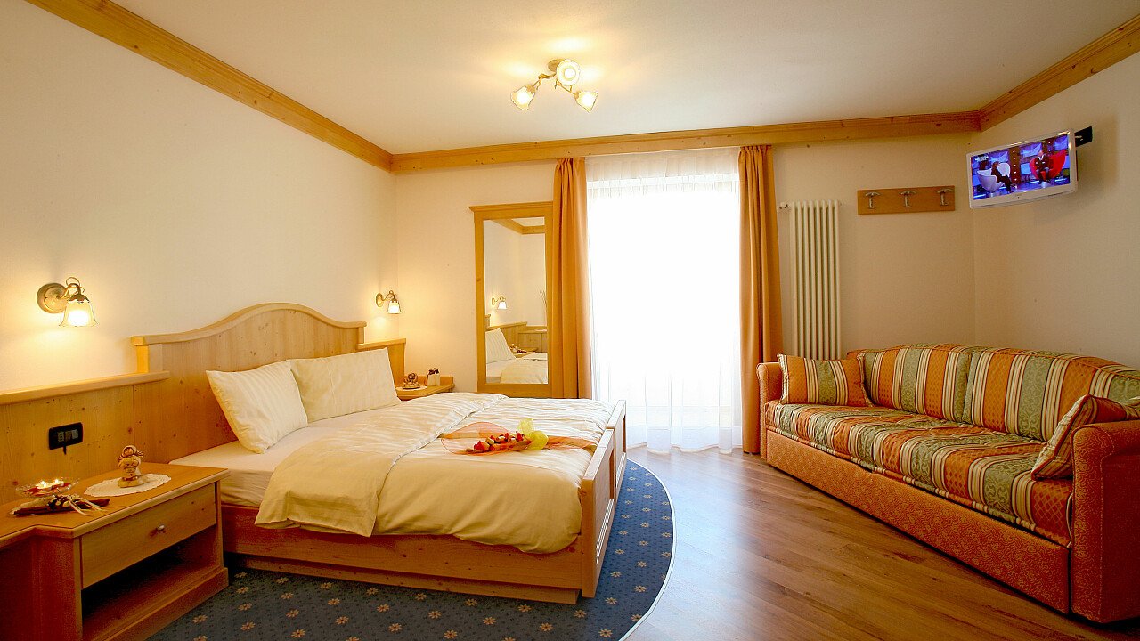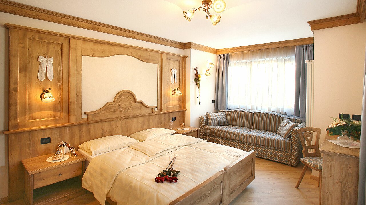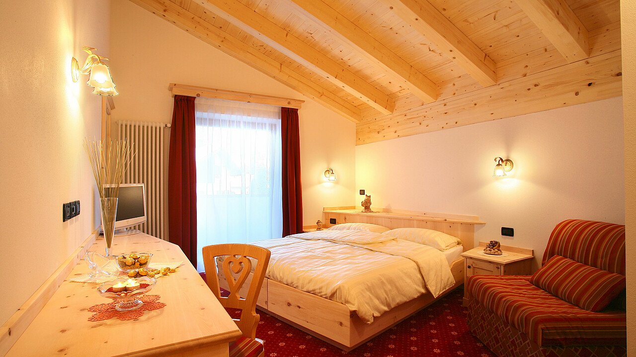 Tutte le camere, sia comfort che superior, sono dotate di balcone con vista panoramica sulle cime del Pordoi e Sella, letto matrimoniale - o letti singoli, scrivania, posa valigie, angolo salotto con divano, tv, cassaforte e servizi igienici.