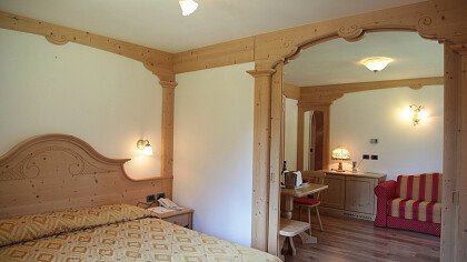 Nelle spaziose camere e suite si trovano i servizi igienici, tv, cassaforte, telefono e l'asciugacapelli. Alcune camere hanno un balcone da cui si può godere di una vista panoramica della Val di Fassa. Nelle vicinanze dell'albergo si trovano anche alcuni appartamenti, monolocali e bilocali dotati di doppi servizi, tv, lavastoviglie, lavatrice, stanze con balcone, garage.