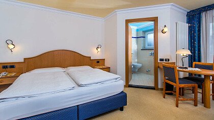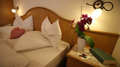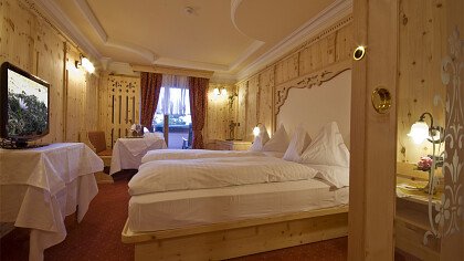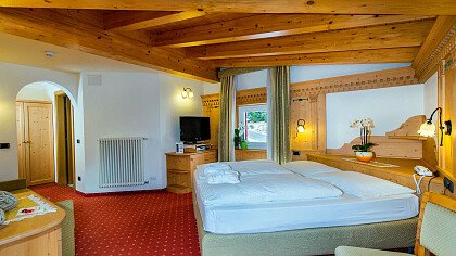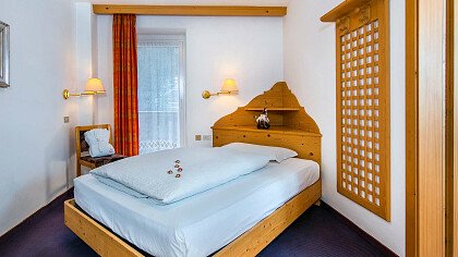 Le sue camere accoglienti, anallergiche e tutte arredate con legno di cirmolo offrono anche comfort moderni come TV satellitare, Wi-Fi, bagno con doccia o vasca, cassetta di sicurezza, telefono e asciugacapelli.