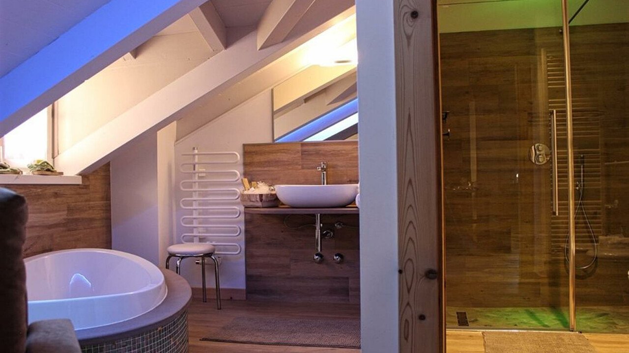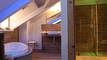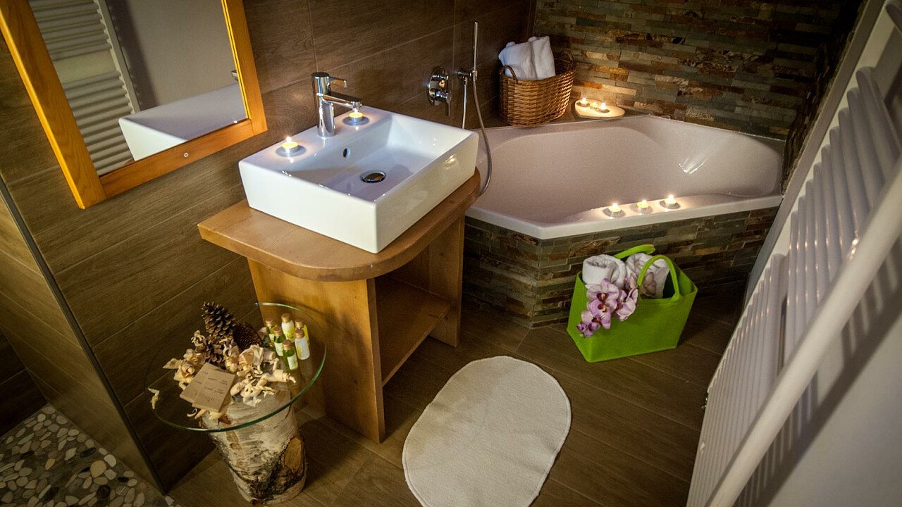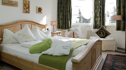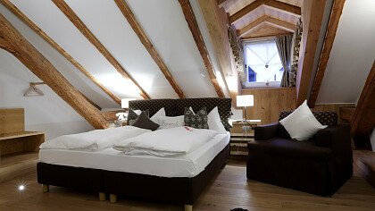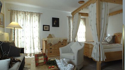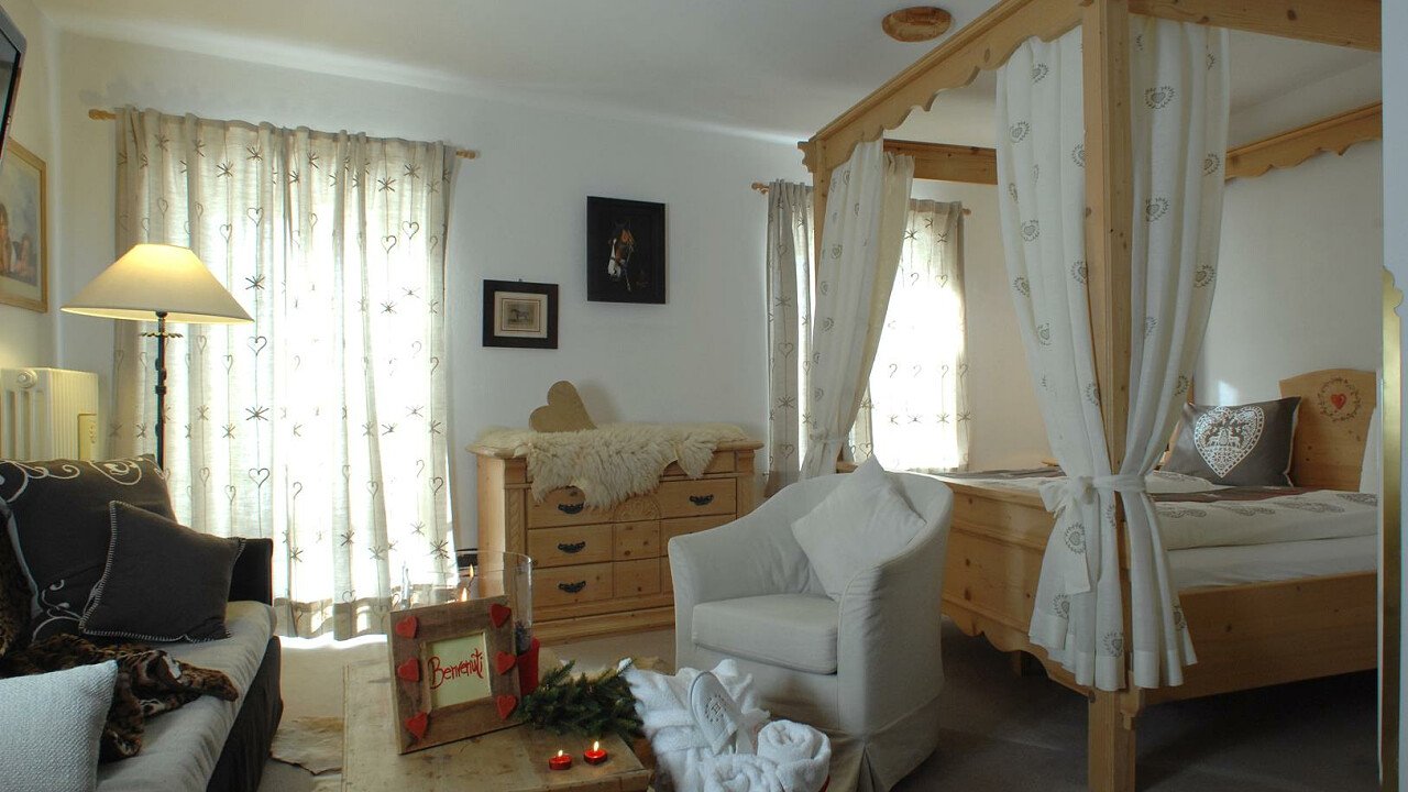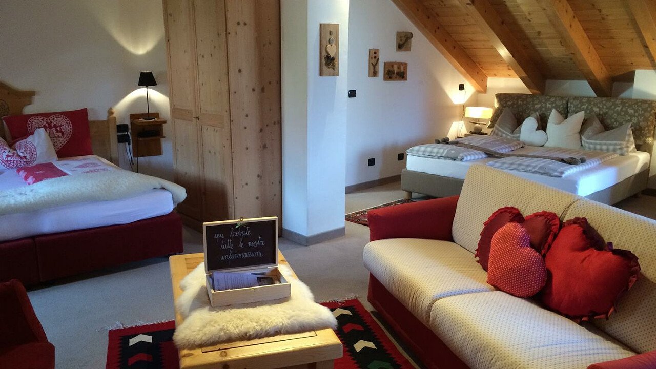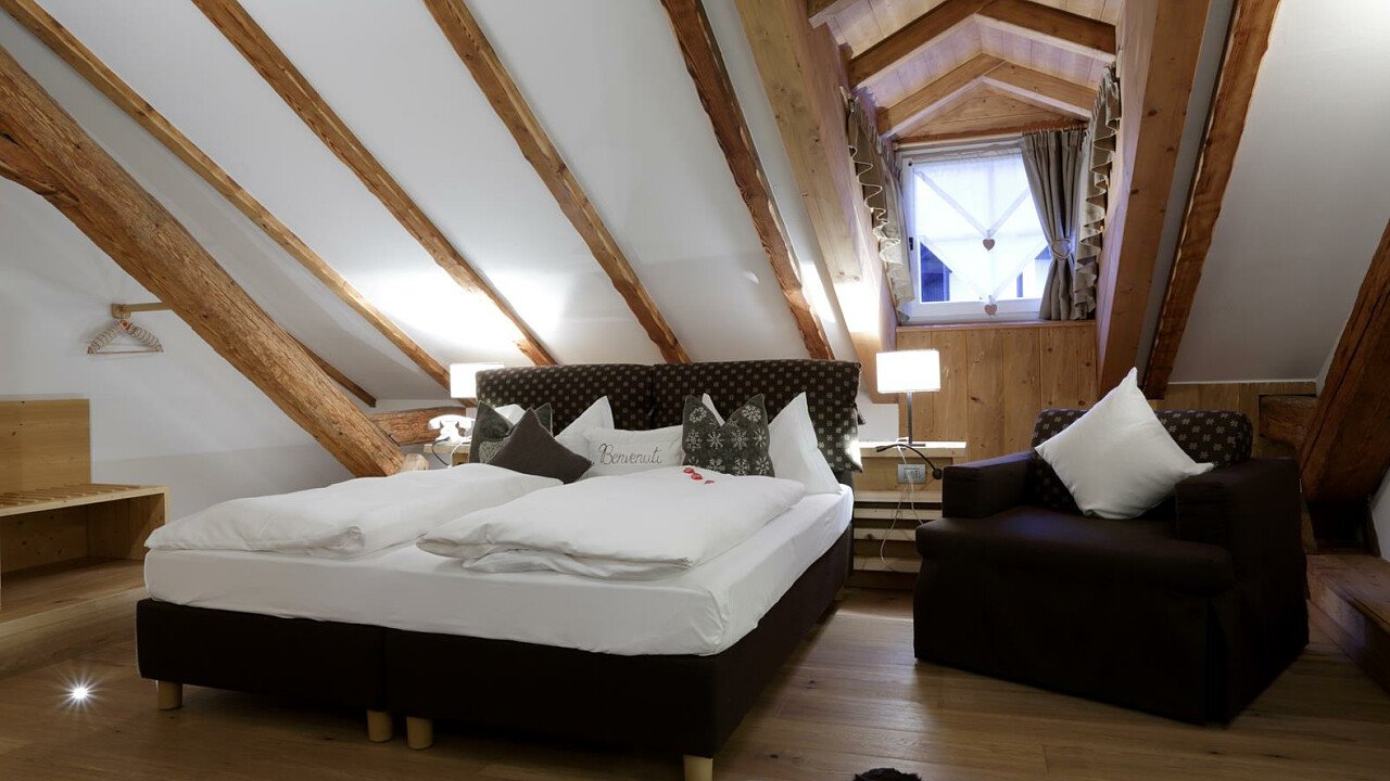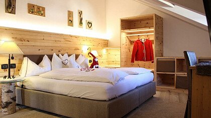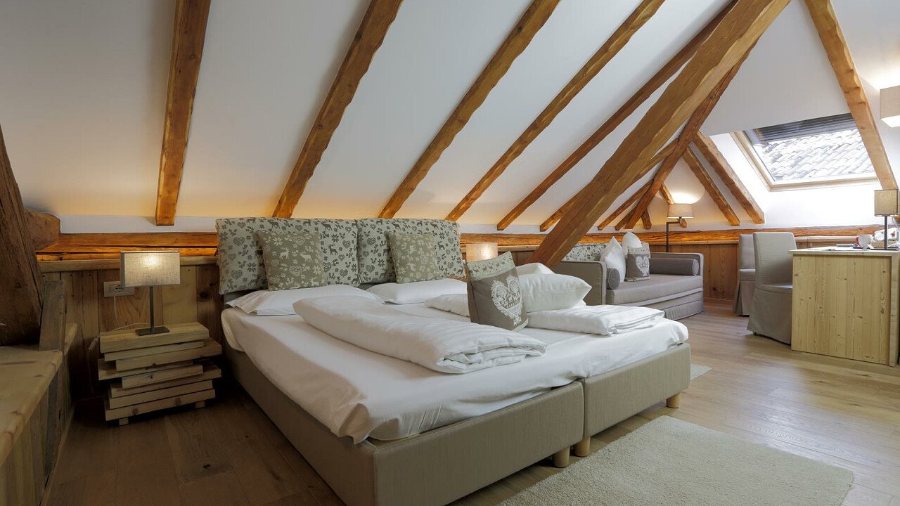 Le romantiche camere e suite, ognuna diversa dall’altra, profumate al cirmolo e con vista panoramica, sono dotate di: TV, telefono, cassaforte, bagno con doccia o vasca, Wi-Fi, borsa wellness, angolo caffè e tè, minibar, phon e servizio cortesia con prodotti ricavati da piante ed erbe della zona.