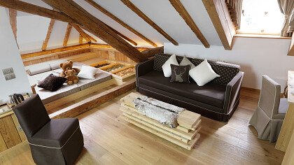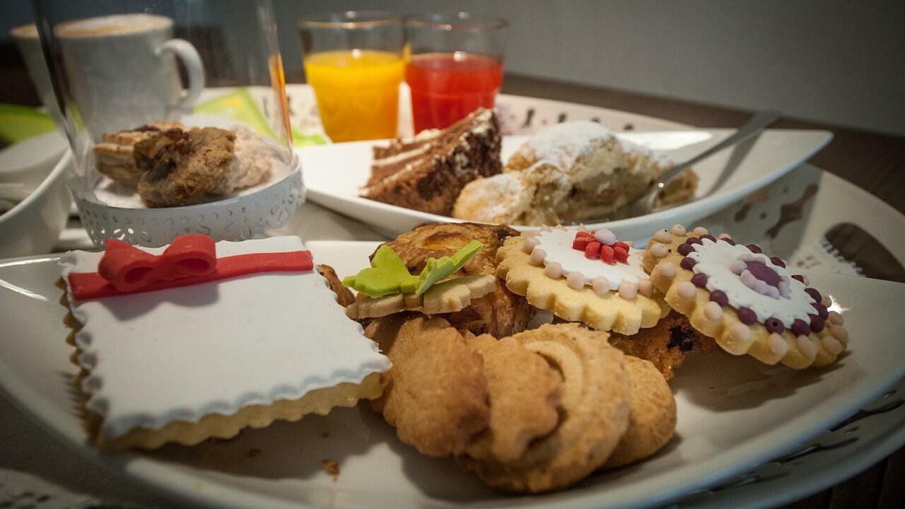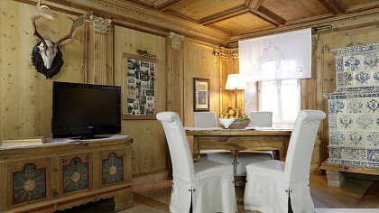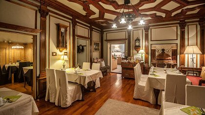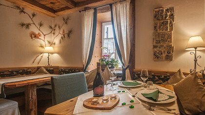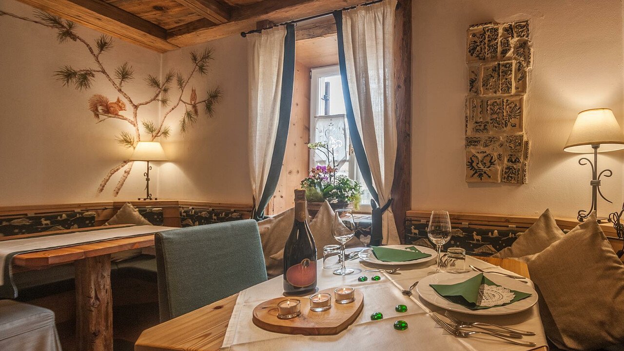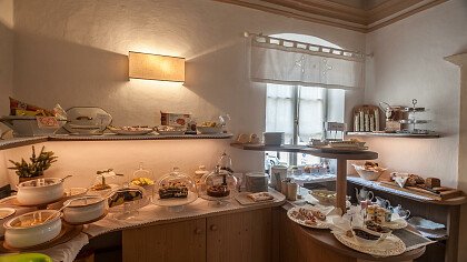 Nella confortevole sala colazione con spettacolare vista sulle Dolomiti, gli ospiti possono assaggiare un buon cappuccino accompagnato da una squisita brioche o un panino con speck e formaggio, golosi dolci fatti in casa o rinfrescanti centrifughe di frutta fresca. In alta stagione potrete gustare una ricca merenda pomeridiana nella Speck Stube.