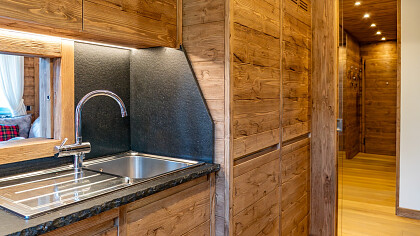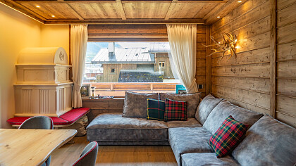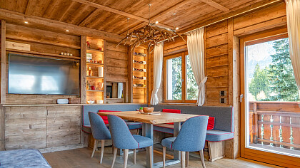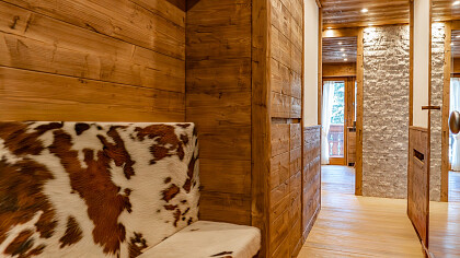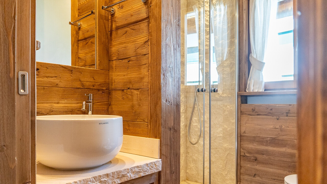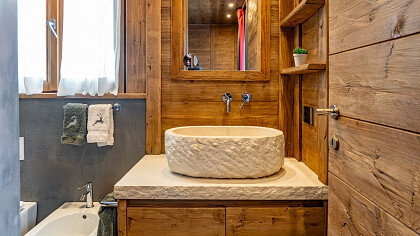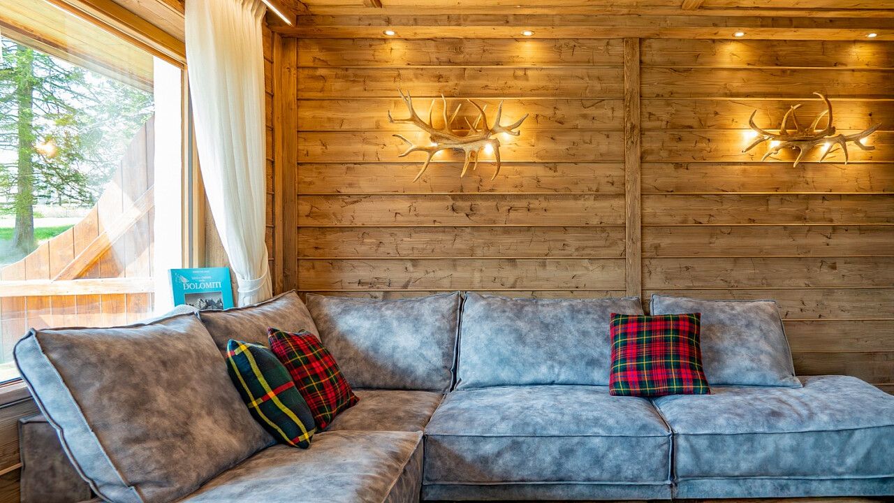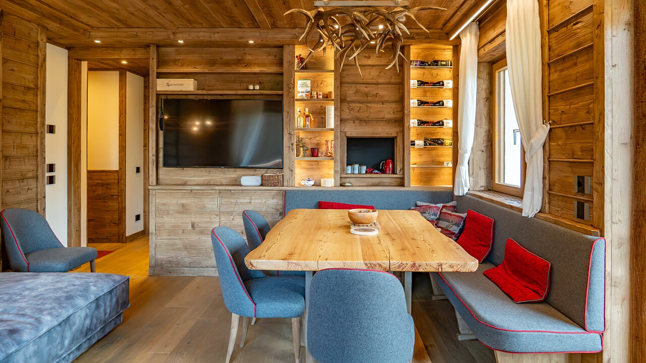 Gli ambienti interni si distinguono per l’impiego di legno massello, boiserie artigianali, una stube in ceramica decorata a mano, pietra naturale e tessuti realizzati a telaio – elementi che definiscono uno stile intramontabile e una finitura artigianale di pregio.