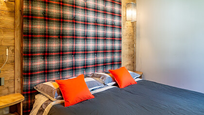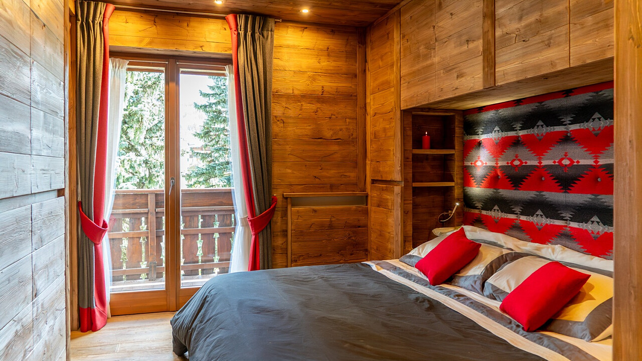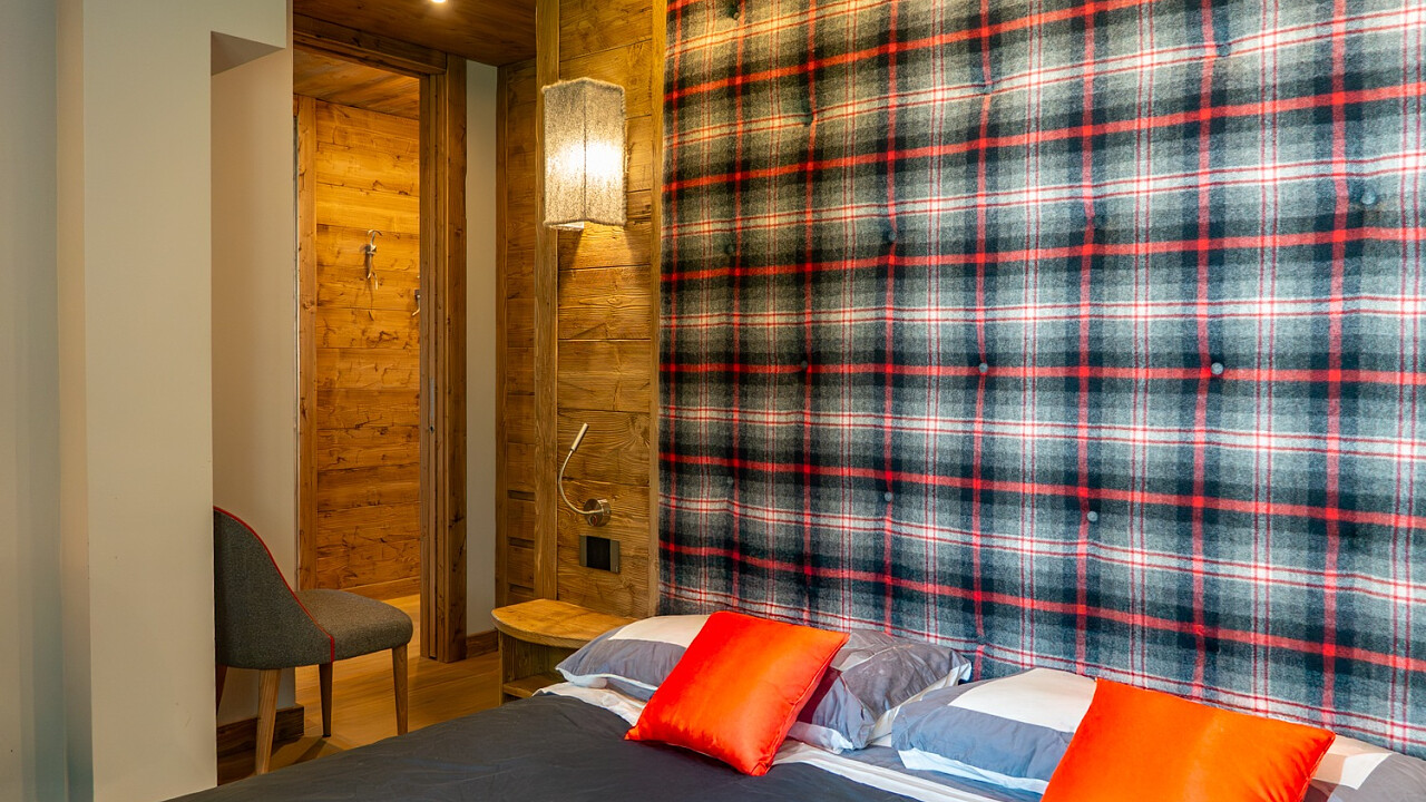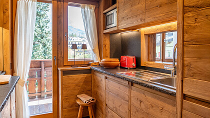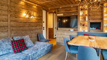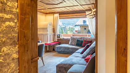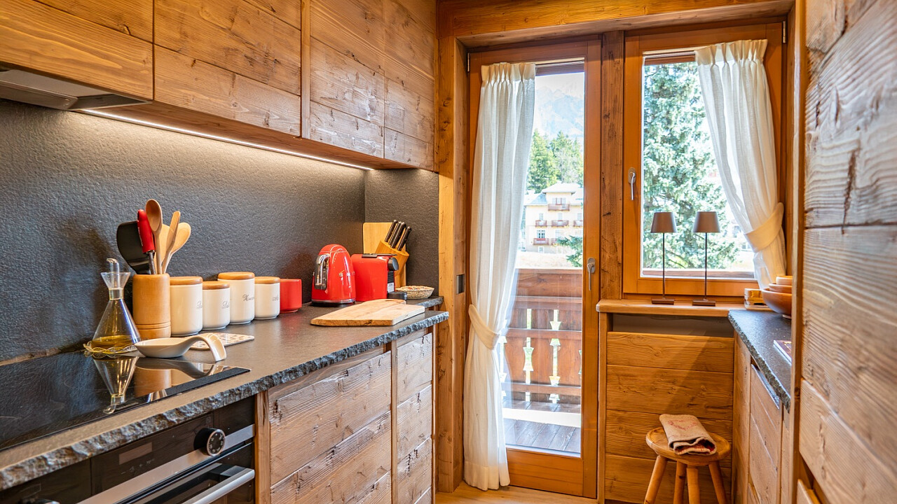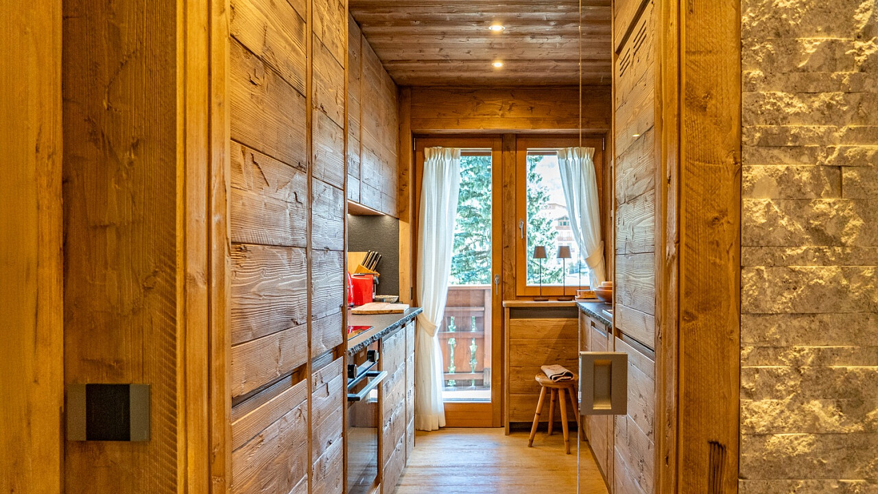La disposizione comprende tre camere da letto, due bagni (di cui uno en suite a servizio della camera padronale), una cucina completamente accessoriata in stile alpino e un soggiorno panoramico su misura, affacciato su un ampio terrazzo con vista sulle montagne.