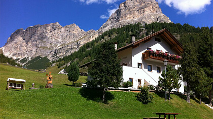 Gestione familiare, posizione tranquilla ai piedi dell'altopiano del Puez - Valle Stella Alpina, poco fuori dal centro, vicino alle piste da sci e passeggiate, con vista sul gruppo del Sella.