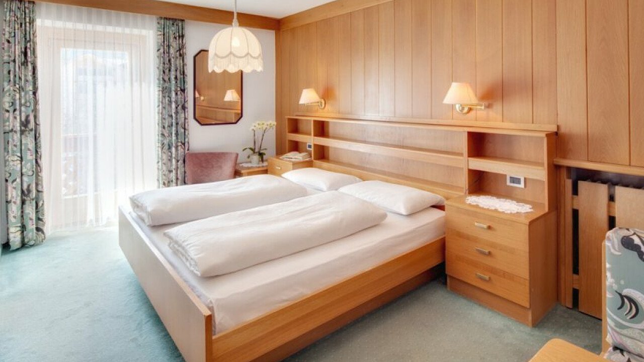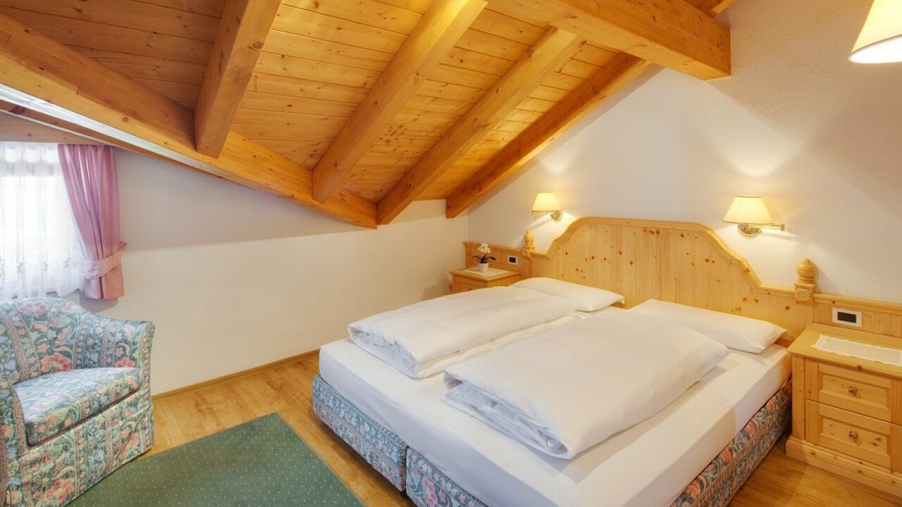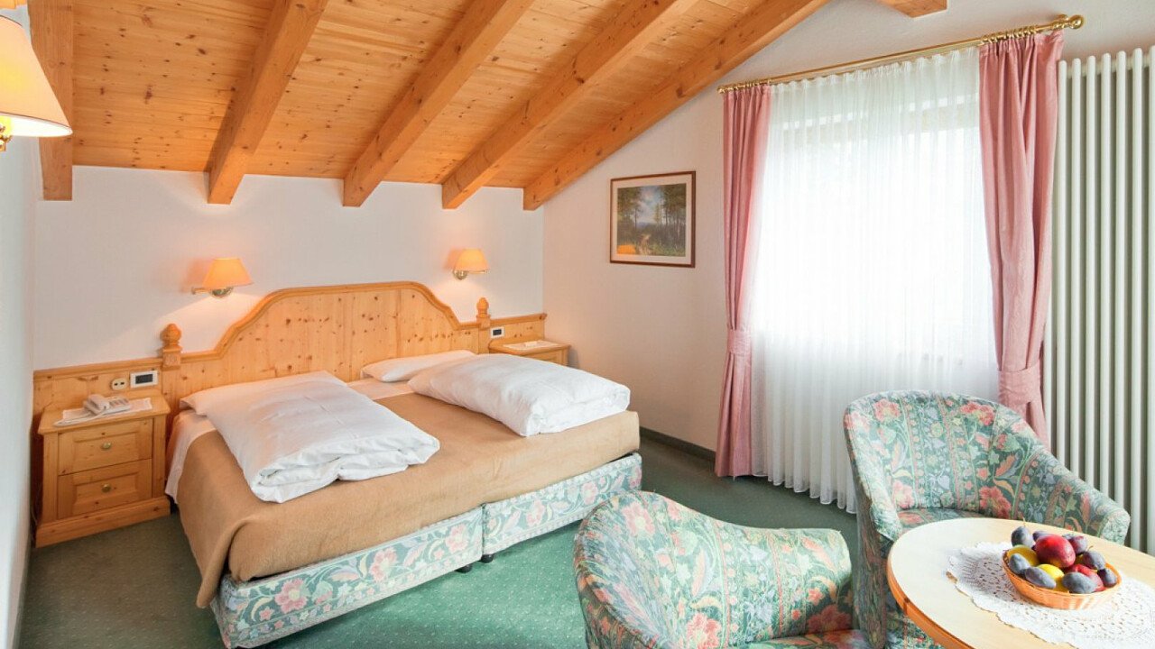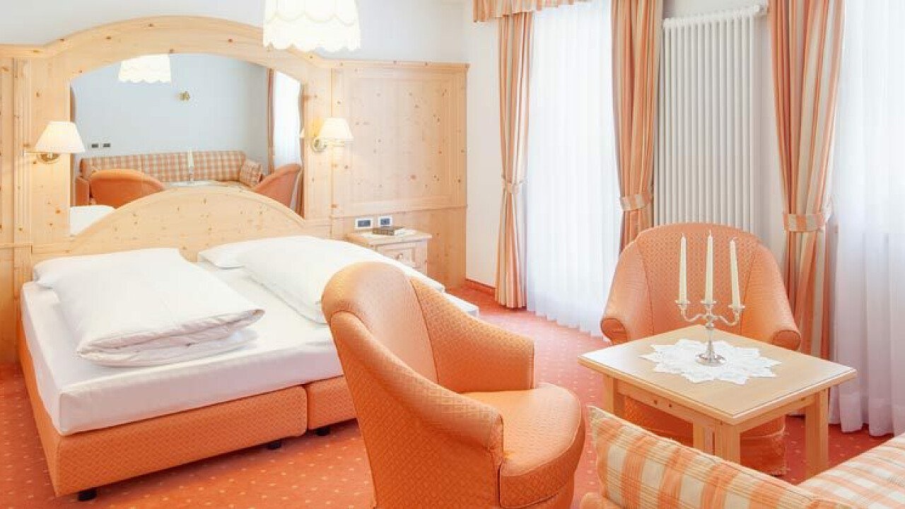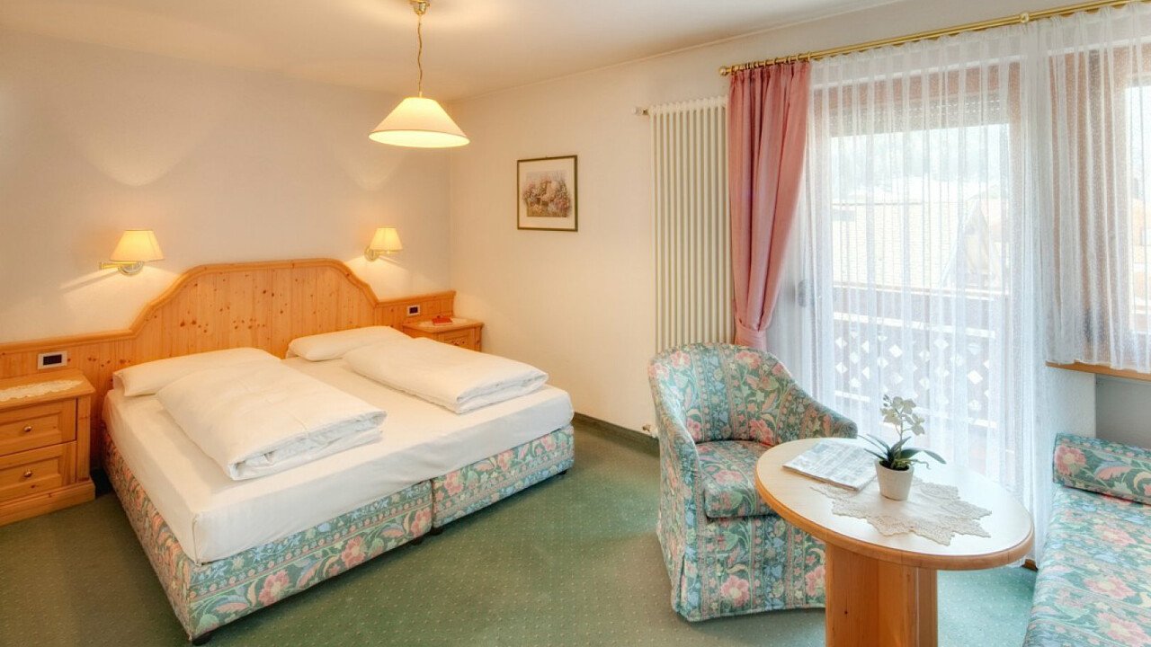 Le graziose camere e suite arredate in legno secondo lo stile tipico alpino sono dotate di TV, telefono, cassaforte, bagno con doccia o vasca, Wi-Fi e balcone.