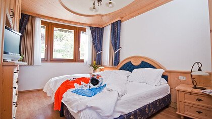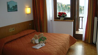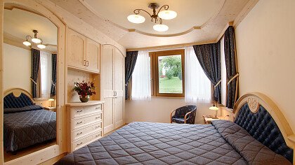 Le camere e suite arredate in legno si compongono di: bagno con vasca e doccia, TV, Wi-Fi, telefono, cassaforte, phon e, alcune, di balcone. Per le famiglie: ampie stanze famigliari con due camere comunicanti con bagno in comune. Room service previa richiesta e a pagamento.