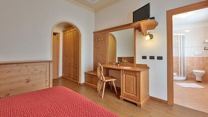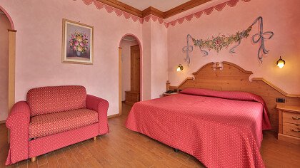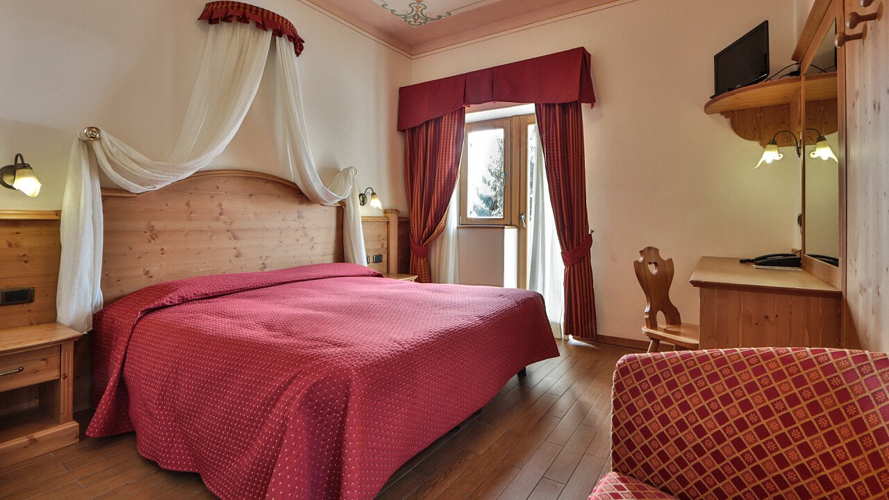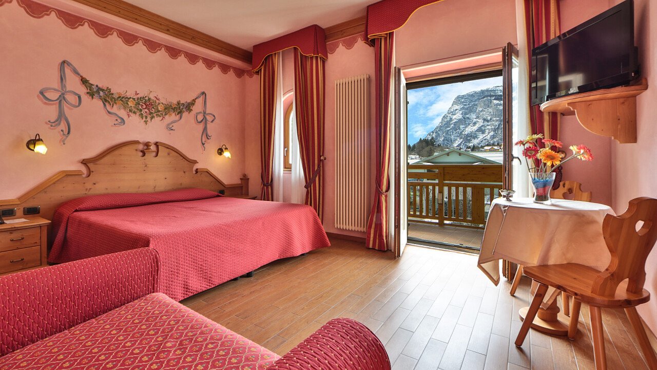 Le camere e suite arredate secondo lo stile alpino si dotano di telefono, bagno con doccia, phon, tv, cassaforte e balcone.