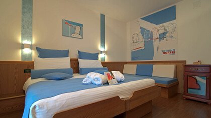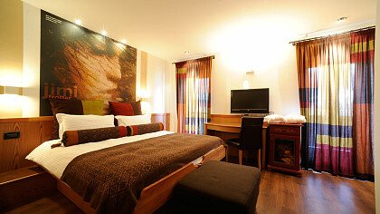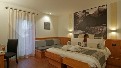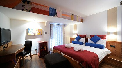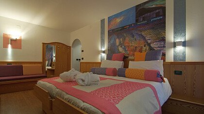 L'ambiente è elegante con ampi spazi dedicati all'arte e alla musica. Si offrono sia camere personalizzate a tema artistico (Art Room) e musicale (Music Room), nate dalla passione dei titolari per queste discipline, sia comfort in stile alpino o moderne e ampie family junior suite. Tutte dispongono di bagno, tv, balcone, frigobar, cassaforte e asciugacapelli. Alcune dotate di salottino, arredamento in legno di cirmolo, doppi servizi, vasca idromassaggio e impianto stereo. Le triple e le quadruple sono ideali per le famiglie.