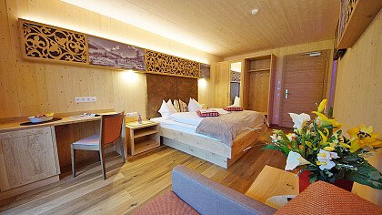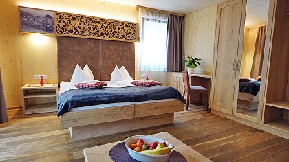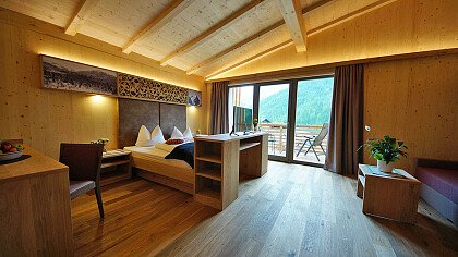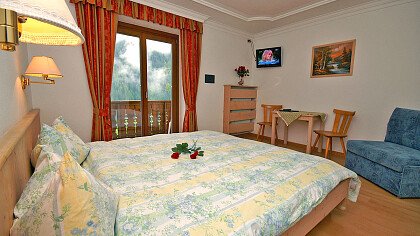 Gli ospiti possono scegliere tra quattro tipologie di camere (standard, panorama, chalet superior e chalet junior suite). Entrambe sono arredate in legno e dispongono di Wi-Fi, TV, cassaforte, telefono, bagno con doccia, phon e, alcune, di balcone o giardino.