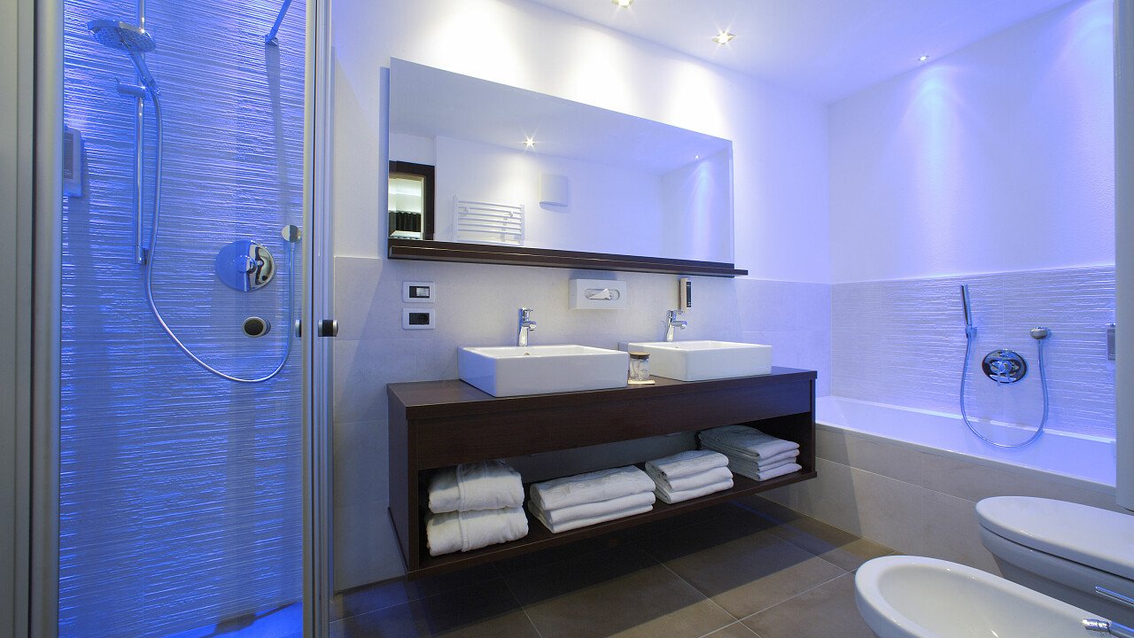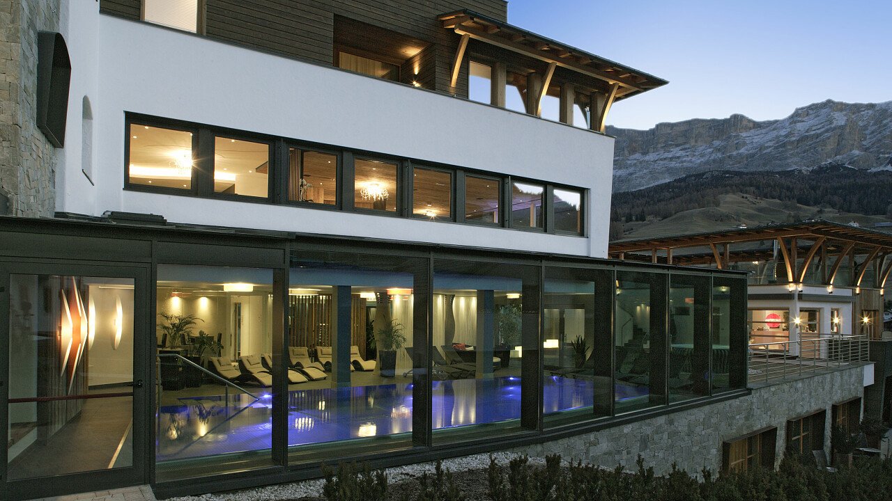Piacevole relax nell'area wellness dell'hotel di La Villa con piscina coperta, sauna finlandese, bagno turco aromatico, idromassaggio in giardino, terrazza solarium, cabina a raggi infrarossi, palestra.