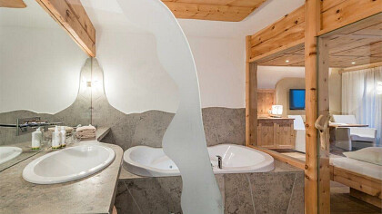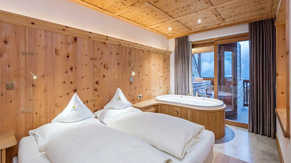 Ampi spazi, rivestiti organicamente con pietra naturale e legno di pino della Valle di Luson, sono un vero capolavoro di artigianato. I bagni in marmo, i pavimenti in rovere, le due spaziose suite Wellness e le due accoglienti camere Zirm al terzo piano si trovano a 150 metri dall'hotel. Il camino, la sauna o l'idromassaggio creano un'atmosfera romantica.