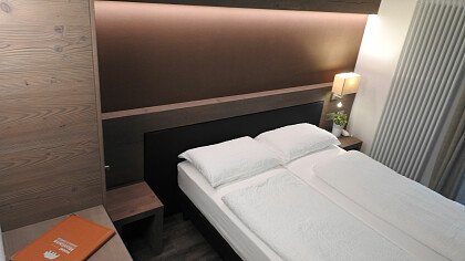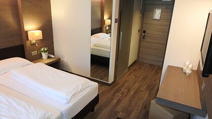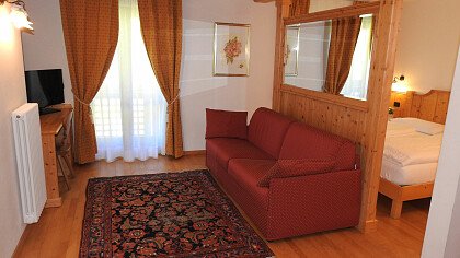 Le spaziose camere, da singole a fino sei persone, sono accoglienti e spaziose con telefono, tv satellitare, WiFi internet, cassaforte e balcone con vista sul centro abitato o sui boschi del Parco Naturale Adamello Brenta. Alcune con vasca idromassaggio.